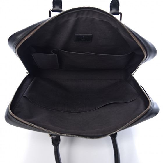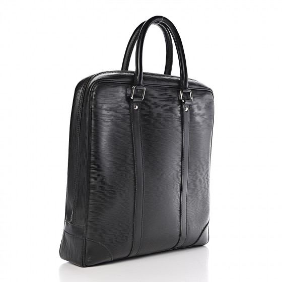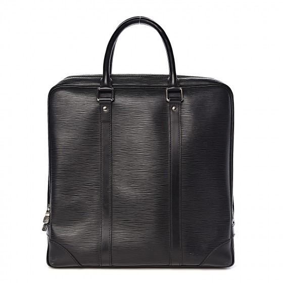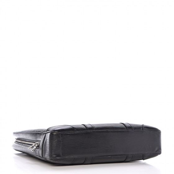 Black document briefcase is crafted of Louis Vuitton signature textured epi leather. The bag features smooth rolled leather top handles with silver links, and a wrap-around zipper. This opens to a black fabric interior with room for a laptop.