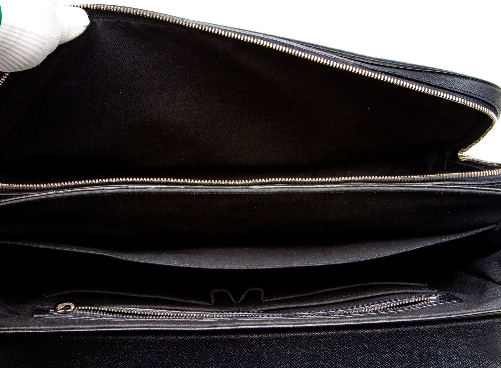 Black taiga leather Vassili briefcase with silver-tone hardware, leather top handle, removable strap, exterior zip pocket, push-lock closure at the front flap and multiple interior compartments.