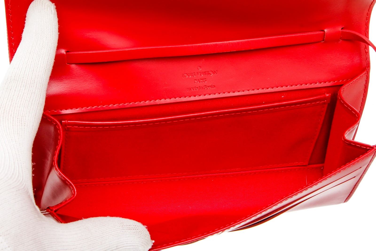 This Louis Vuitton's cherry red Epi leather Honfleur clutch bag features a front flap with snap button closure, four card slots with gold hardware and a detachable adjustable shoulder strap.