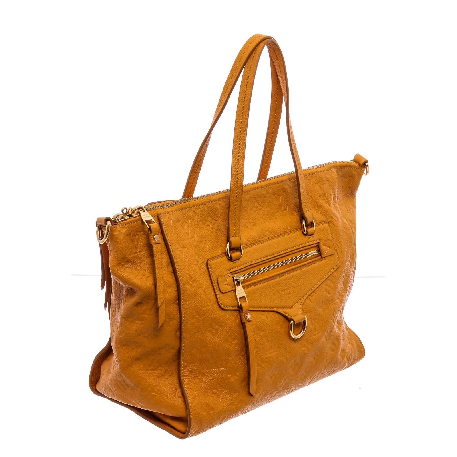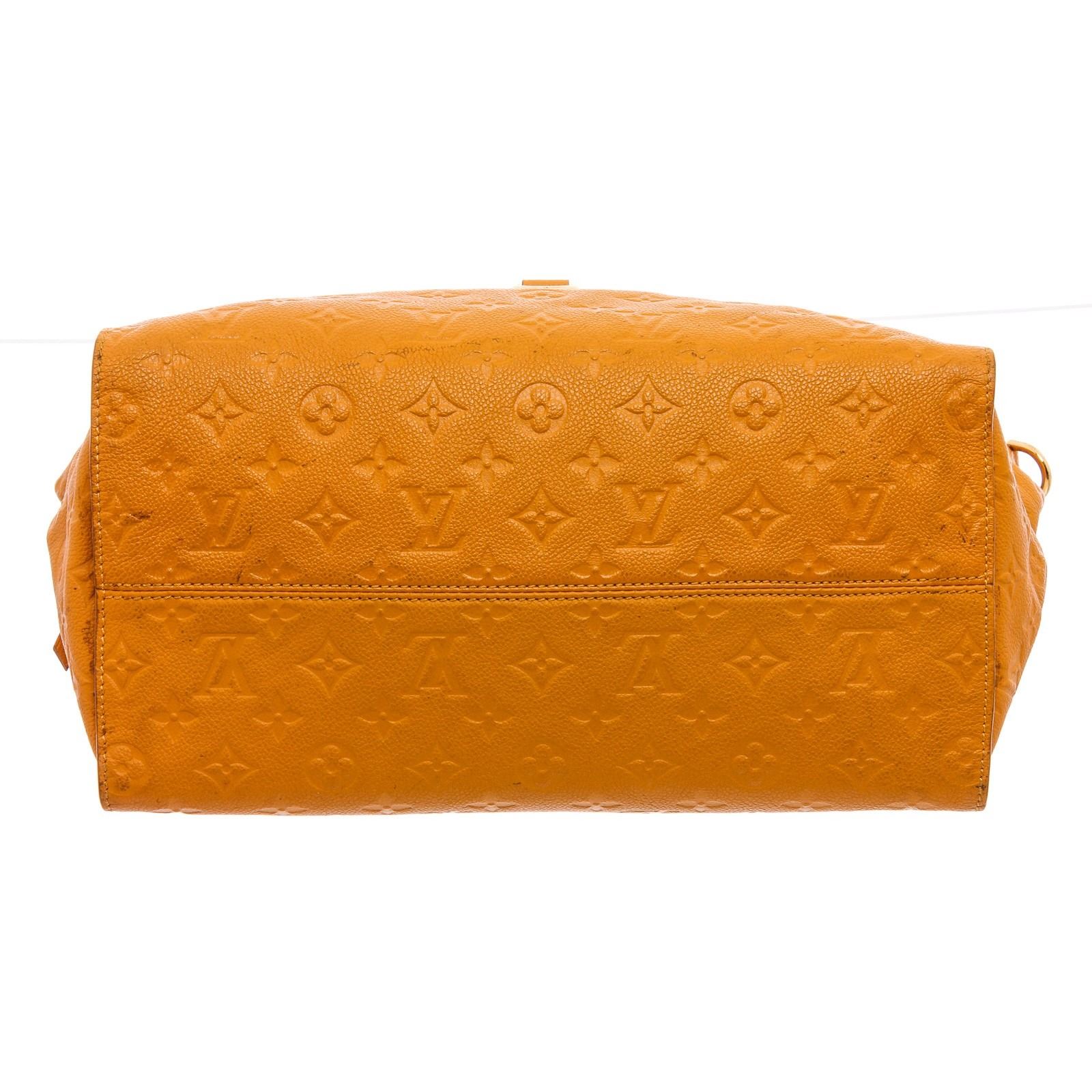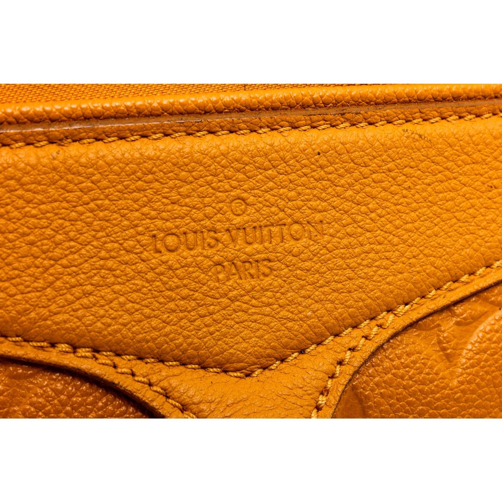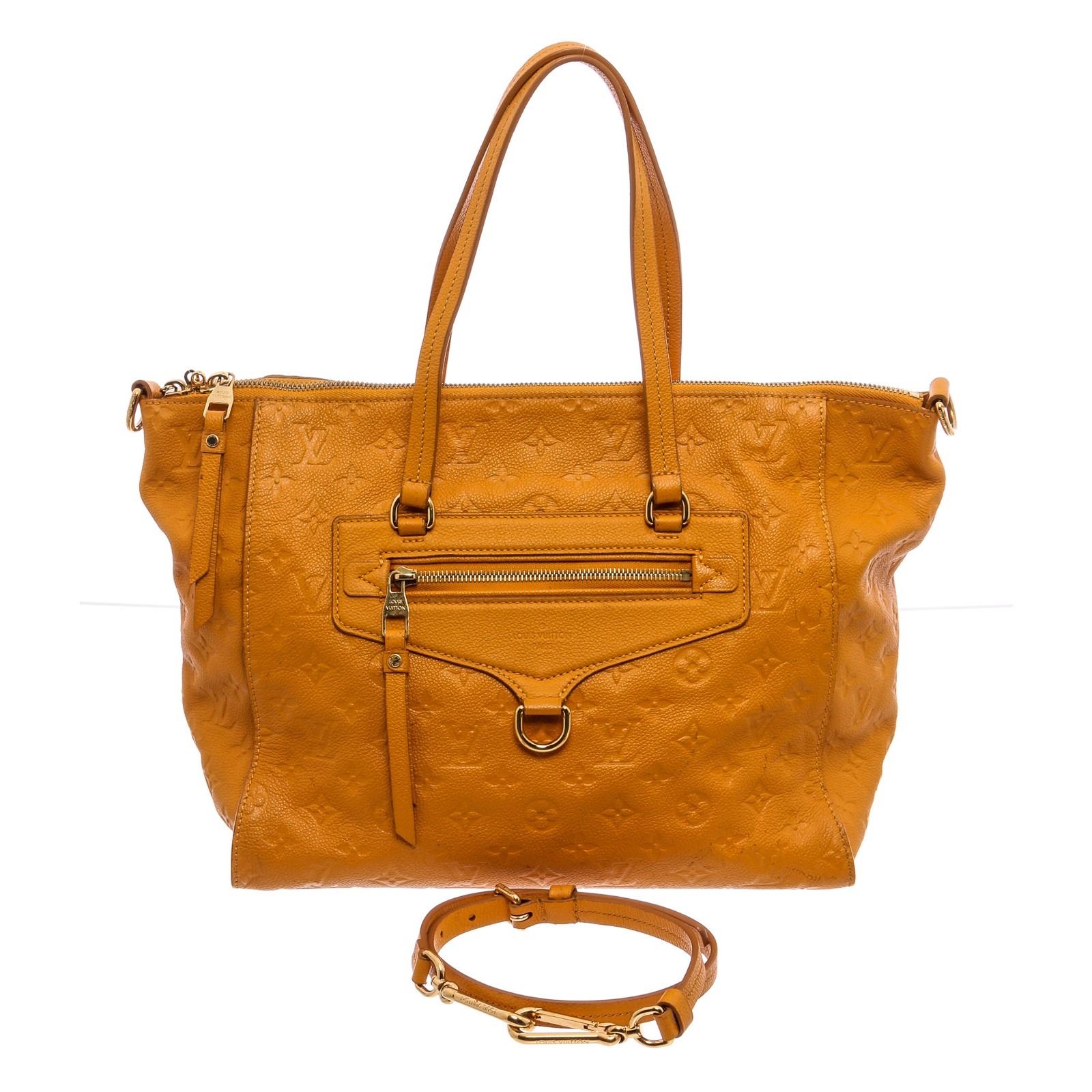 Safran monogram Empreinte leather Louis Vuitton Lumineuse PM with brass hardware, dual flat top handles, single detachable flat shoulder strap, single zip pocket and embossed logo at front, tonal and brown stripe print woven lining, three pockets at interior wall; one with zip closure and two-way zip closure at top.