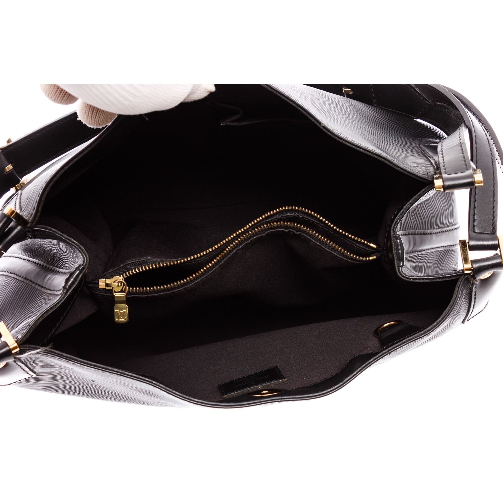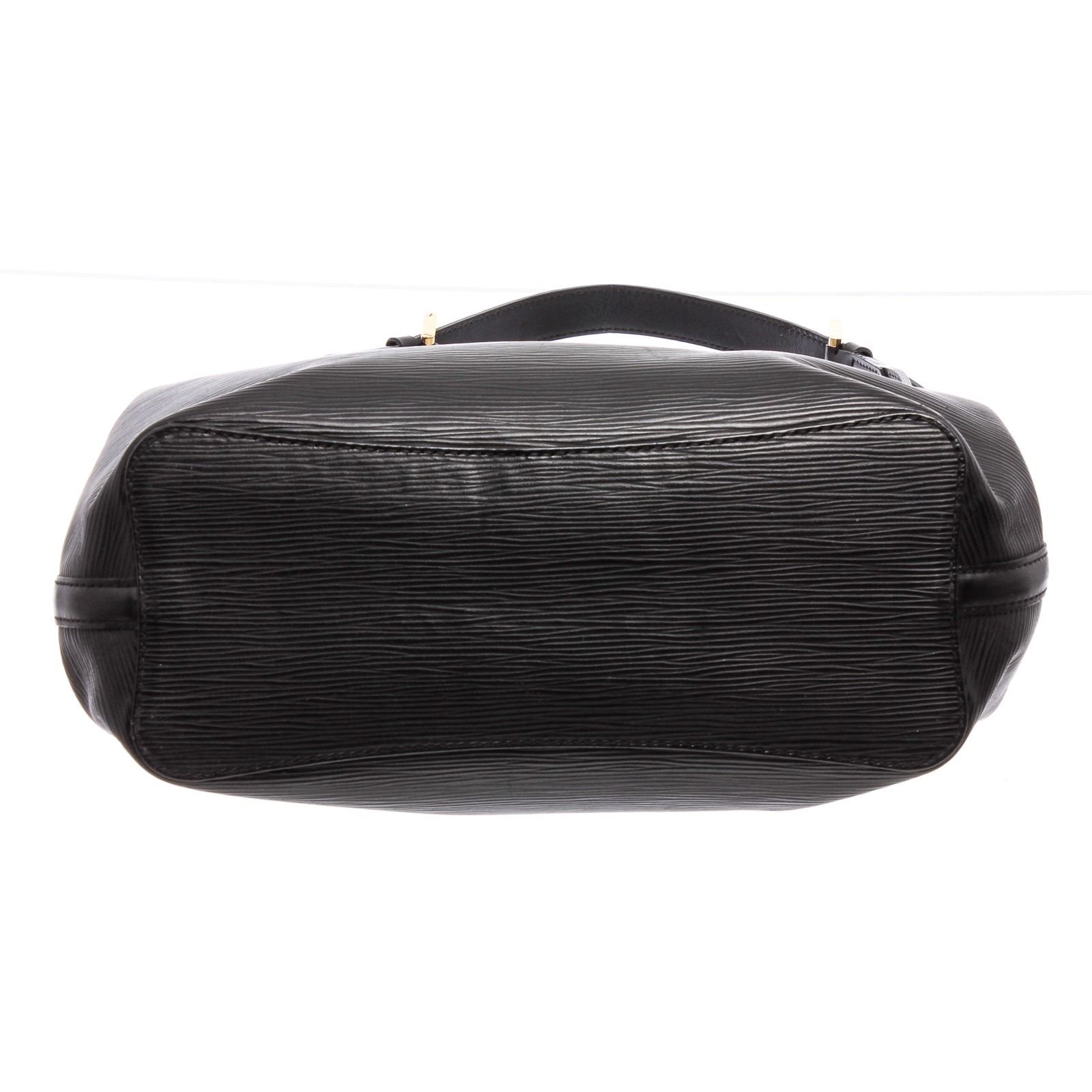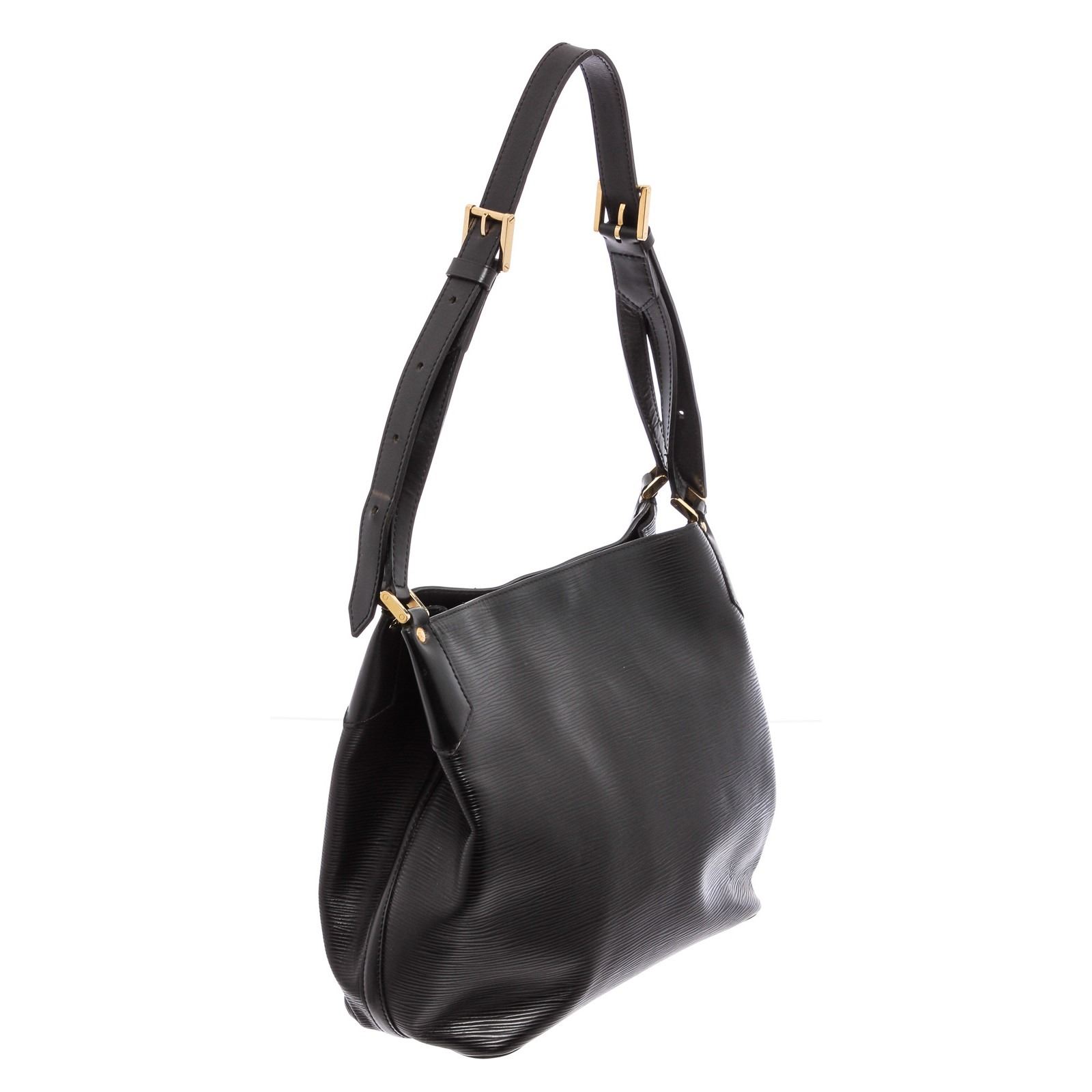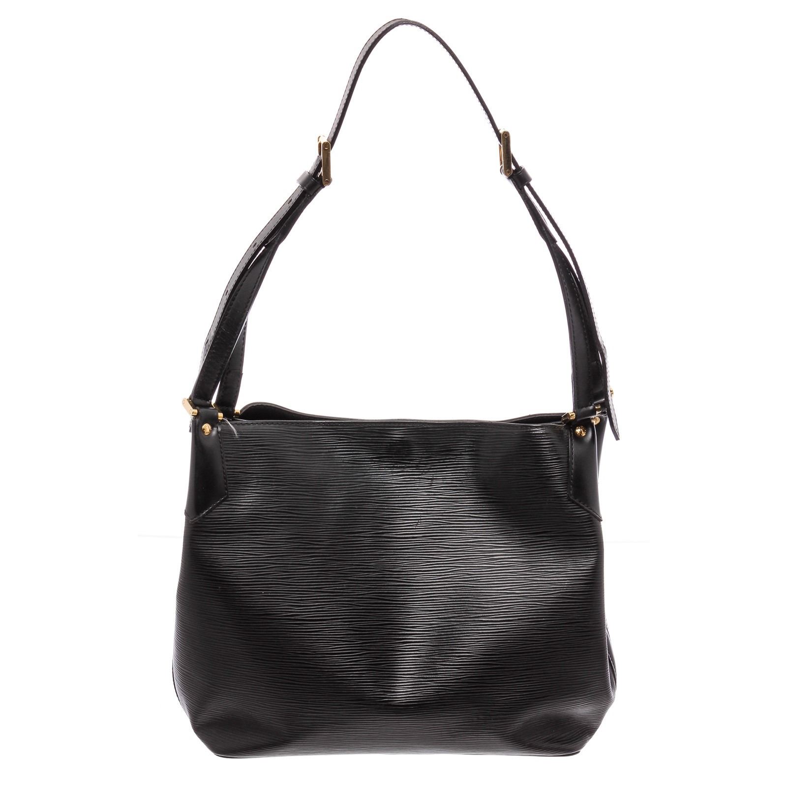 Black Epi leather Louis Vuitton Mandara PM with brass hardware, adjustable flat shoulder strap, embossed logo at front corner, tonal woven lining, single slip pocket at interior wall and magnetic snap closure at top.