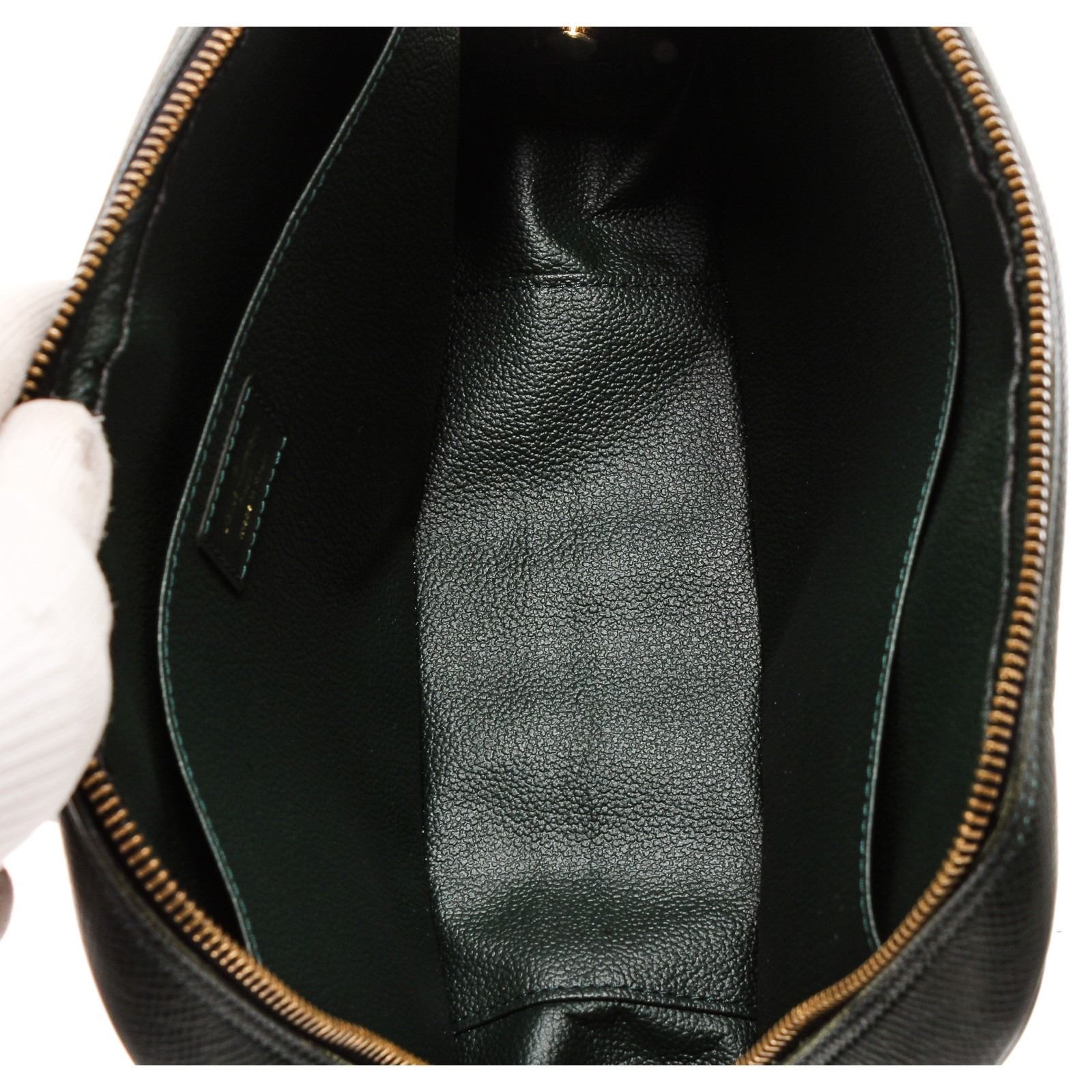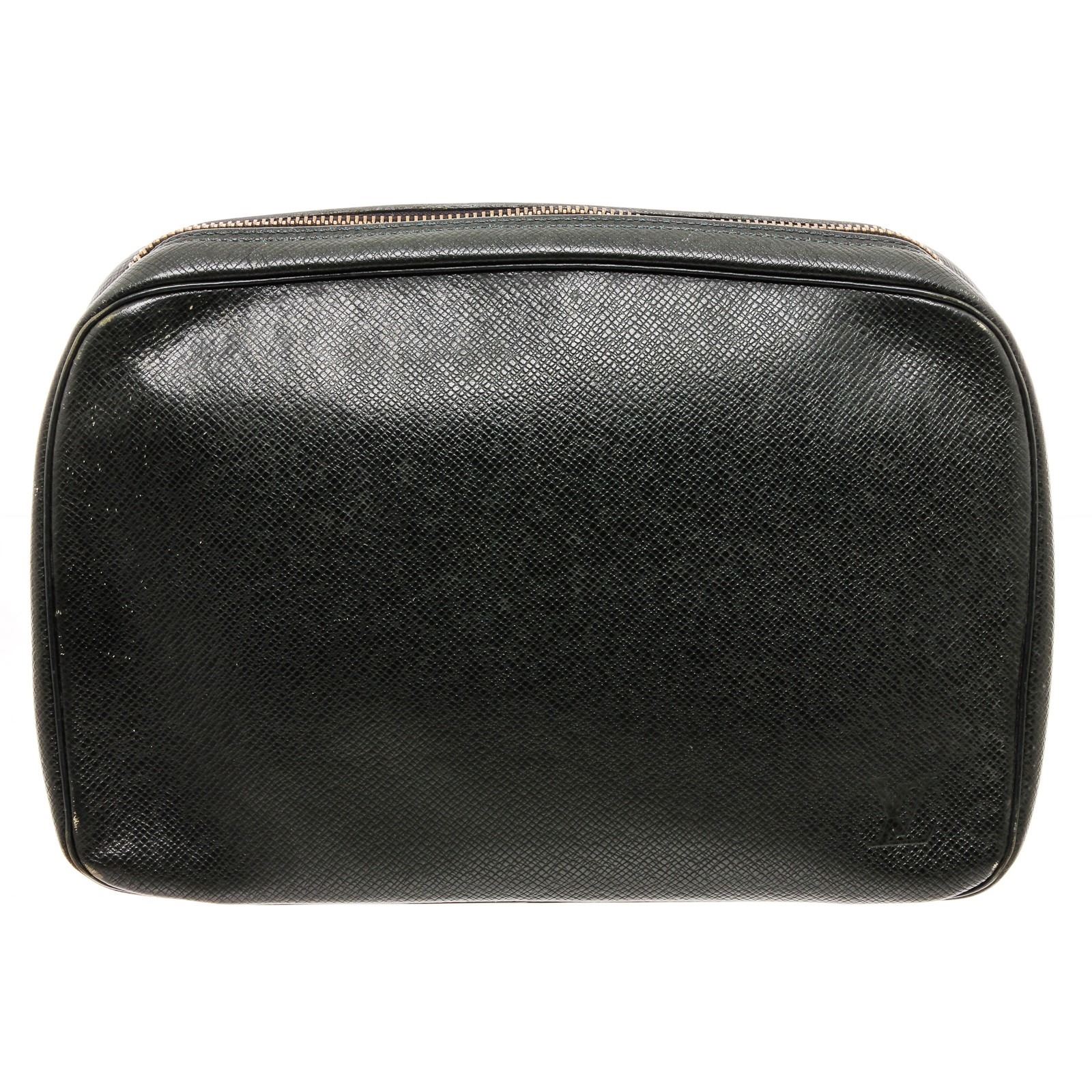 Description: Louis Vuitton Green Leather Dopp Kitt is featured in black leather and your perfect accessory when you don't feel like carrying around a large backpack! Exterior features zipper logo, subtle LV logo. Interior features two interior pouch pockets.