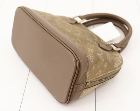 Louis Vuitton Light Brown Monogram Satin Alma Mini Handbag. All available information is listed in the description and shown in the photos. Light brown Monogram satin and leather Louis Vuitton Mini Alma handbag with gold-tone hardware, two rolled top handles and two-way zippers that open to a beige fabric interior. 6" L x 3.25" W x 5" H