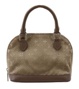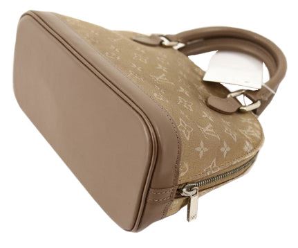Louis Vuitton Light Brown Monogram Satin Alma Mini Handbag. All available information is listed in the description and shown in the photos. Light brown Monogram satin and leather Louis Vuitton Mini Alma handbag with gold-tone hardware, two rolled top handles and two-way zippers that open to a beige fabric interior. 6" L x 3.25" W x 5" H