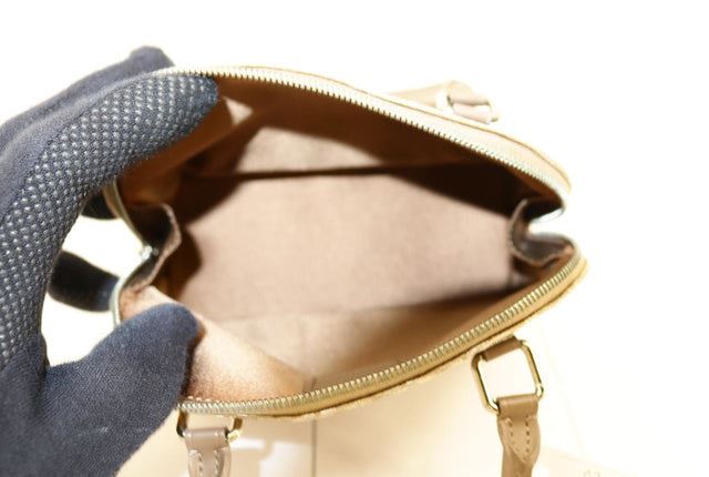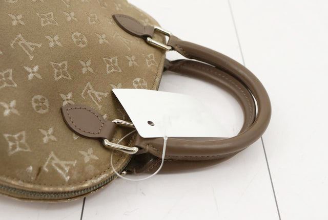 Louis Vuitton Light Brown Monogram Satin Alma Mini Handbag. All available information is listed in the description and shown in the photos. Light brown Monogram satin and leather Louis Vuitton Mini Alma handbag with gold-tone hardware, two rolled top handles and two-way zippers that open to a beige fabric interior. 6" L x 3.25" W x 5" H