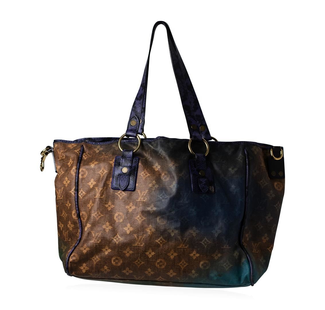 Authentic Louis Vuitton Richard Prince Heartbreak Jokes Tote Bag. This limited edition bag, originally released in 2008, is a true collectors piece of art. The combination of acid colors on monogram canvas make this a one of a kind handbag. The stylish tote comes in a combination of blue, green, purple and orange colors with long purple snake print leather shoulder straps and a small printed line of jokes on one side with polished brass hardware. Large, open microfiber lined interior which makes this bag perfect for everyday use or travel. This bag has been kept in good condition with some signs of wear, (please see photos). Included with this item: Louis Vuitton dust bag. Approximate Measurements: 22" L x 7.5" W x 13.75" H - 16" base length and 11" interior depth.