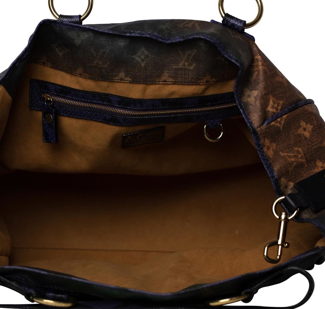 Authentic Louis Vuitton Richard Prince Heartbreak Jokes Tote Bag. This limited edition bag, originally released in 2008, is a true collectors piece of art. The combination of acid colors on monogram canvas make this a one of a kind handbag. The stylish tote comes in a combination of blue, green, purple and orange colors with long purple snake print leather shoulder straps and a small printed line of jokes on one side with polished brass hardware. Large, open microfiber lined interior which makes this bag perfect for everyday use or travel. This bag has been kept in good condition with some signs of wear, (please see photos). Included with this item: Louis Vuitton dust bag. Approximate Measurements: 22" L x 7.5" W x 13.75" H - 16" base length and 11" interior depth.