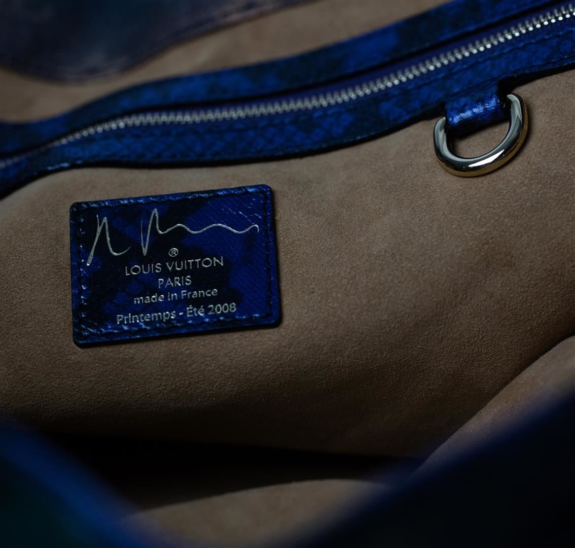 Authentic Louis Vuitton Richard Prince Heartbreak Jokes Tote Bag. This limited edition bag, originally released in 2008, is a true collectors piece of art. The combination of acid colors on monogram canvas make this a one of a kind handbag. The stylish tote comes in a combination of blue, green, purple and orange colors with long purple snake print leather shoulder straps and a small printed line of jokes on one side with polished brass hardware. Large, open microfiber lined interior which makes this bag perfect for everyday use or travel. This bag has been kept in good condition with some signs of wear, (please see photos). Included with this item: Louis Vuitton dust bag. Approximate Measurements: 22" L x 7.5" W x 13.75" H - 16" base length and 11" interior depth.