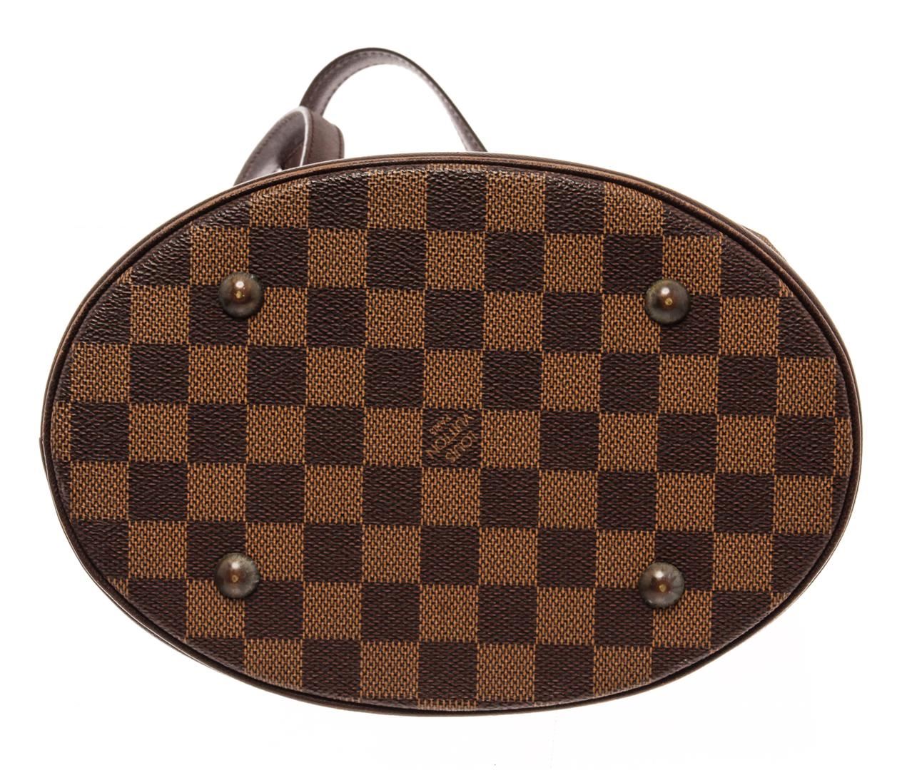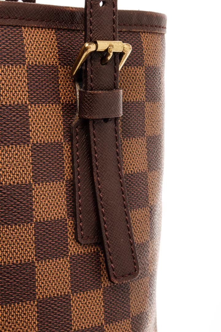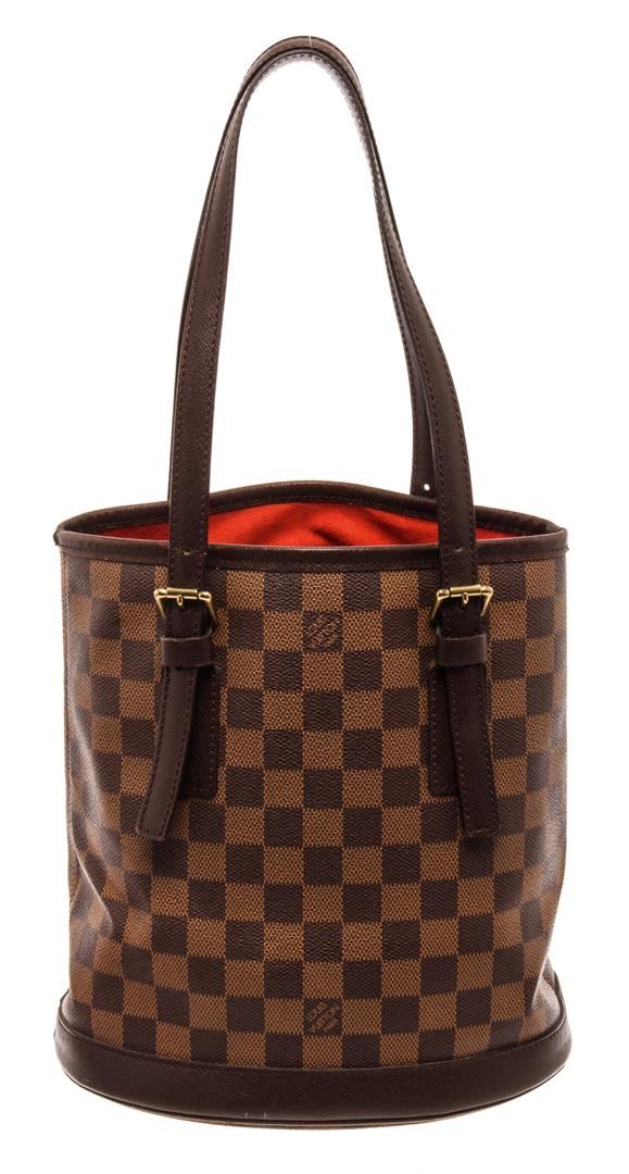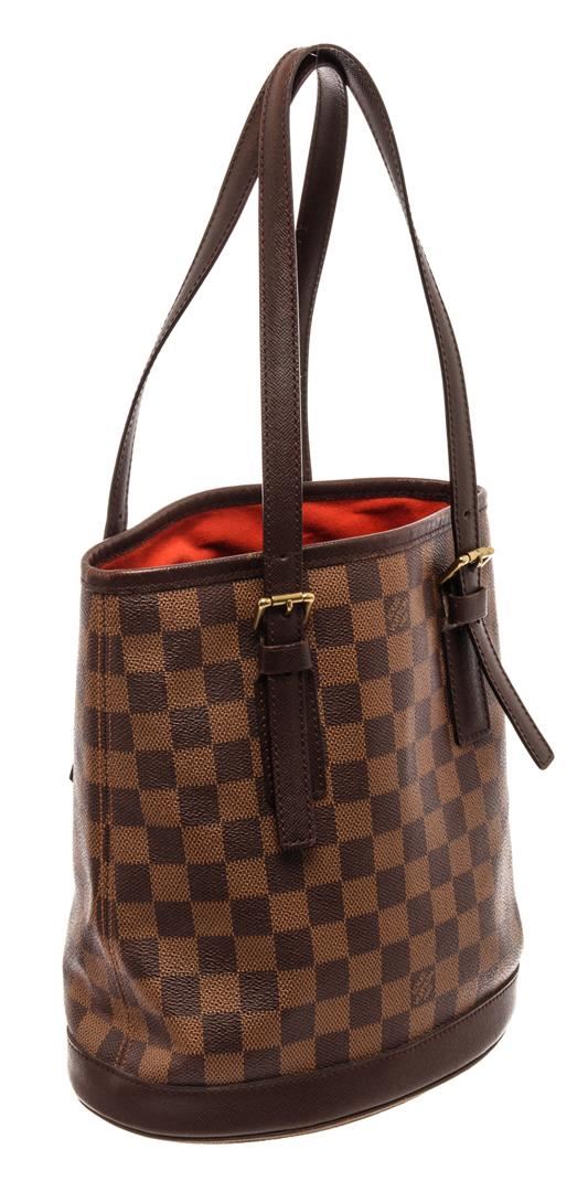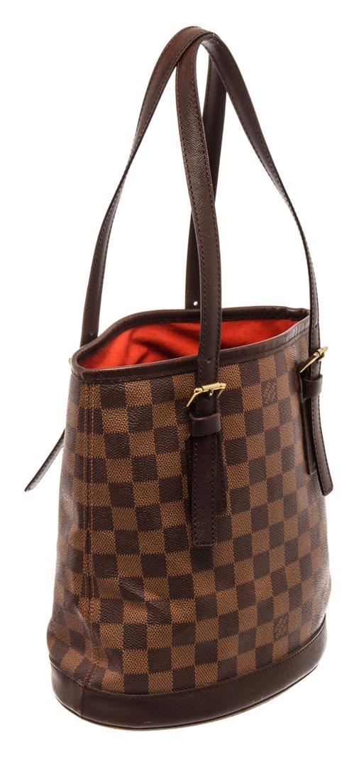Louis Vuitton Marais handbag damier ebene Coated Canvas. Brand: Louis Vuitton, Style: Marais, Type: handbag, Exterior Color: damier ebene, Exterior Material: Coated Canvas, Exterior Pockets: None, Interior Color: burnt orange, Interior Material: suede, Interior Pockets: two zip, Closure: none, Handle/Strap Type: dual top handles, Length: 9, Width: 6, Height: 9 1/2, Handle Drop: 8. Condition: wear on buckle and strap holes. Additional Information: chain attached to zipper pull for keychain, top handles are adjustable like belt. Item is sold AS-IS and all information pertaining to this lot is available in the photos or this description.