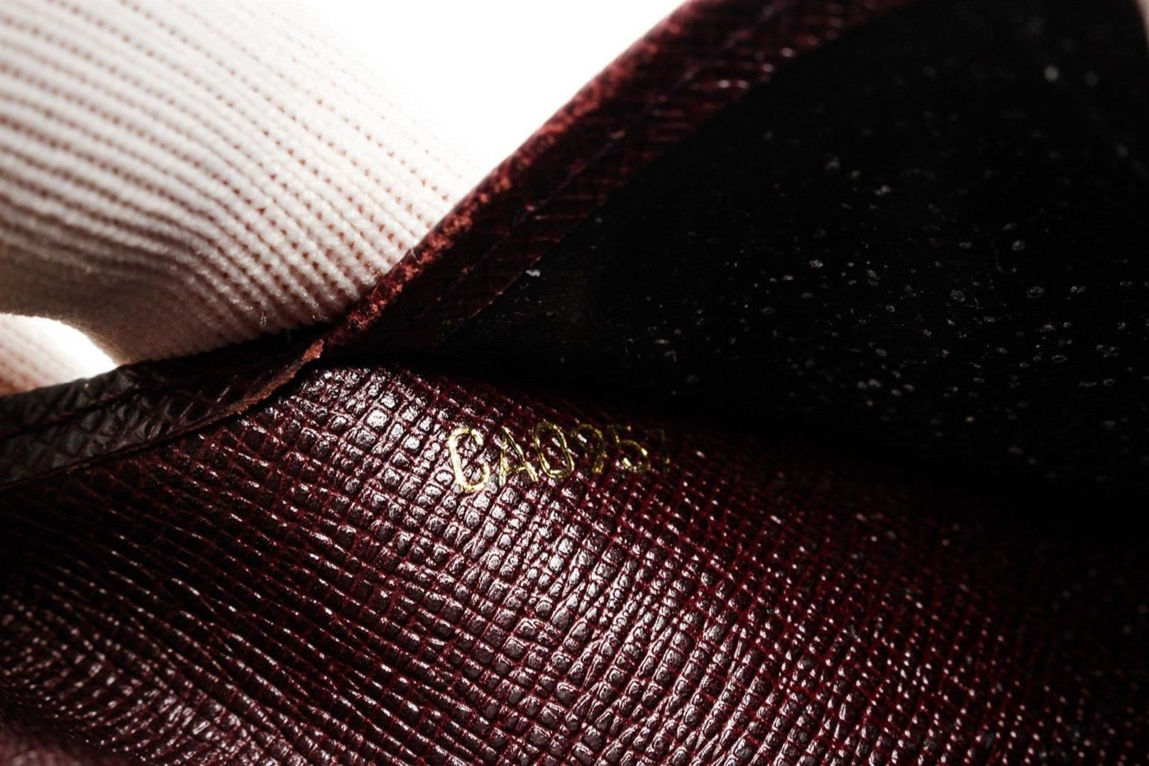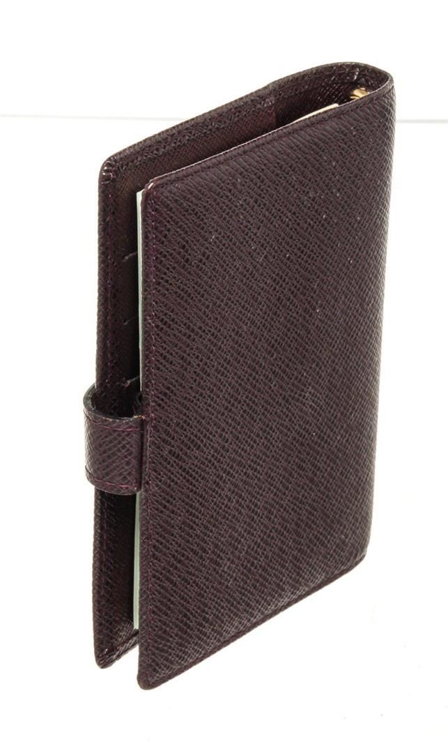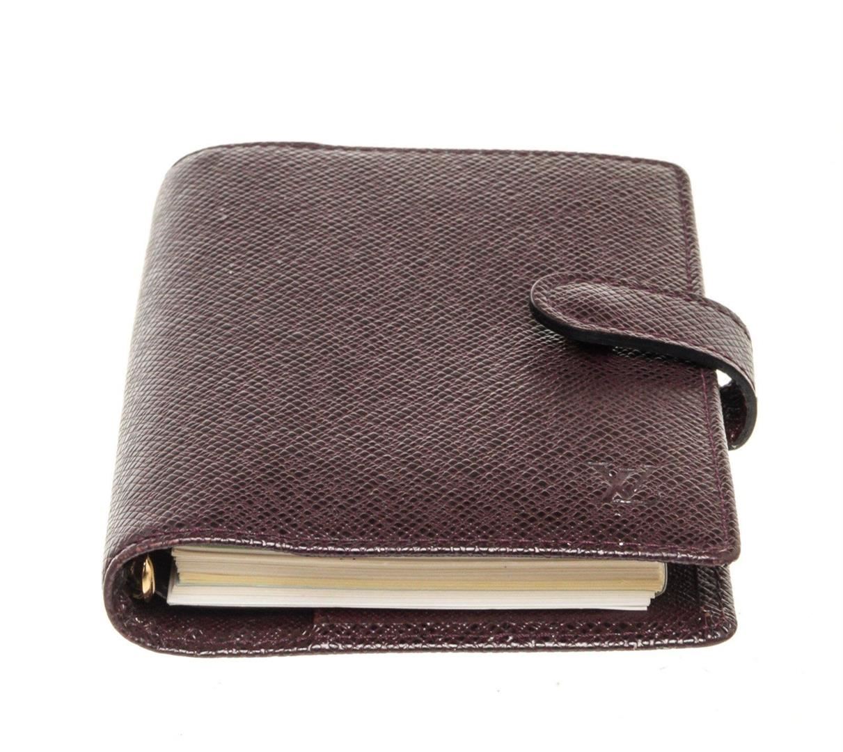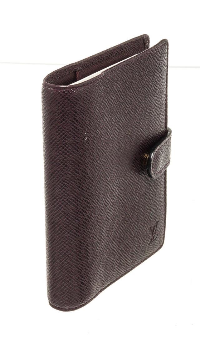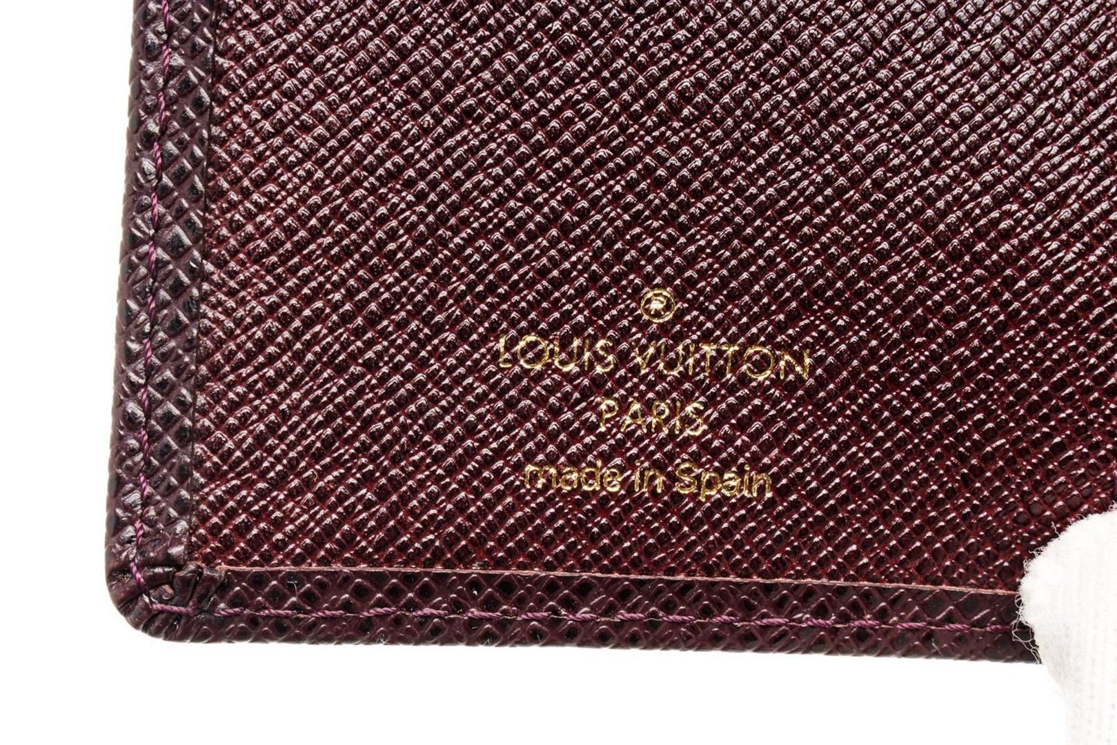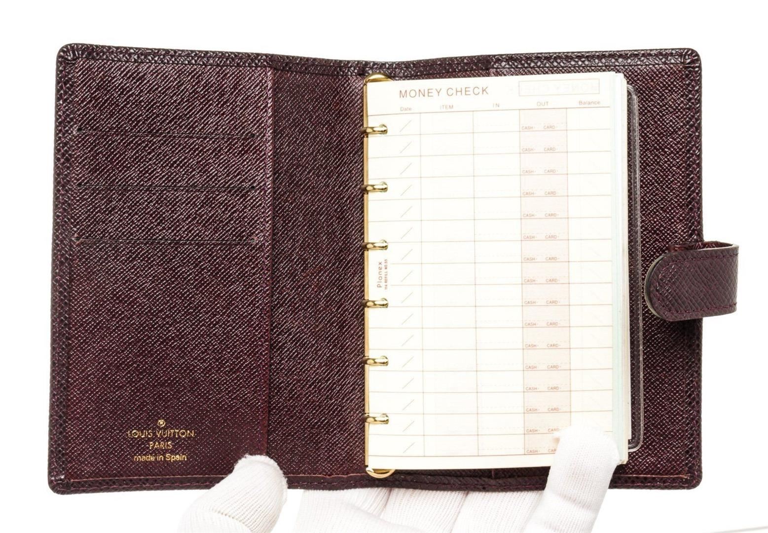 Louis Vuitton Maroon Taiga Leather Agenda PM Wallet with taiga leather, silver-tone hardware, interior flap pockets, leather lining, snap closure.