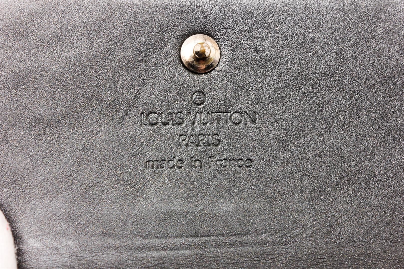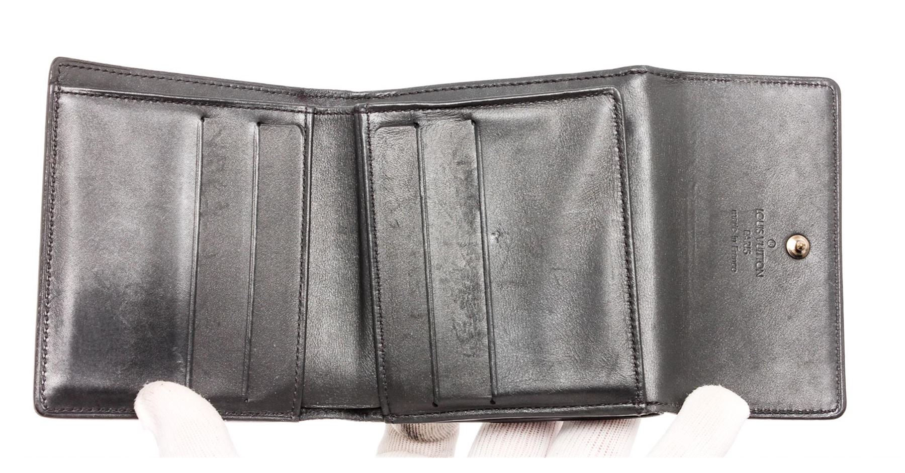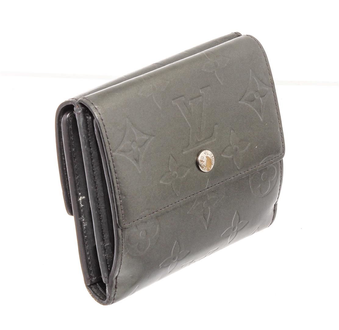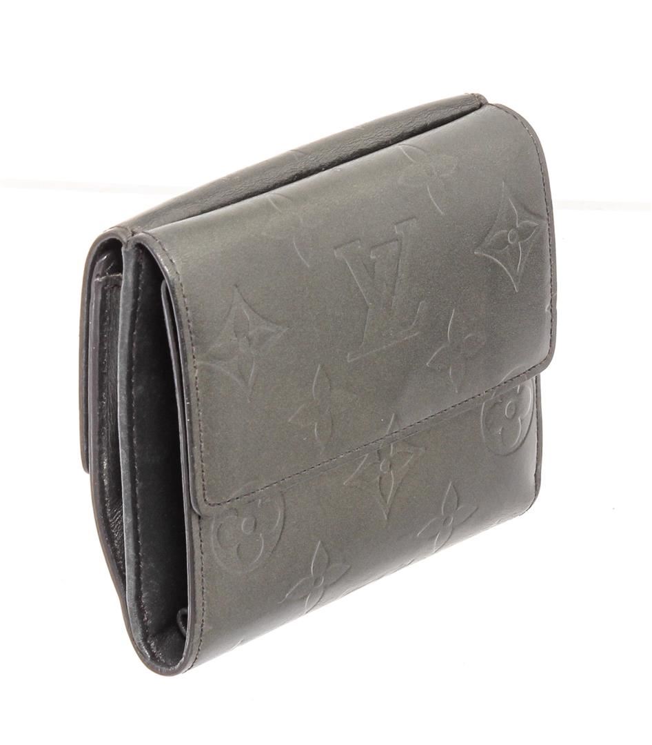 Matte Grey monogram Vernis leather Louis Vuitton Ludlow wallet with brass hardware, dual exterior compartments, tonal leather lining, single bill compartment, dual slit pockets, four card slots at interior walls and dual snap closures at flaps.