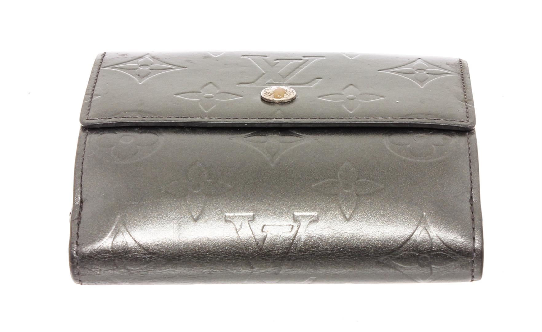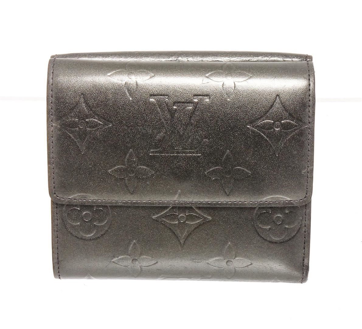 Matte Grey monogram Vernis leather Louis Vuitton Ludlow wallet with brass hardware, dual exterior compartments, tonal leather lining, single bill compartment, dual slit pockets, four card slots at interior walls and dual snap closures at flaps.