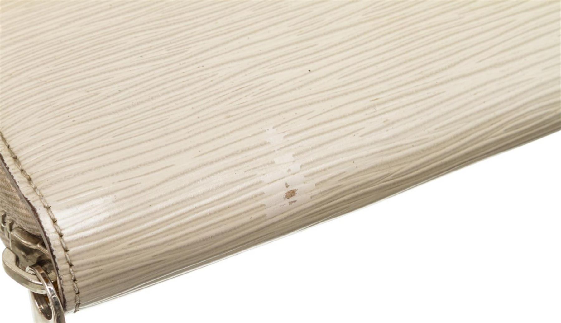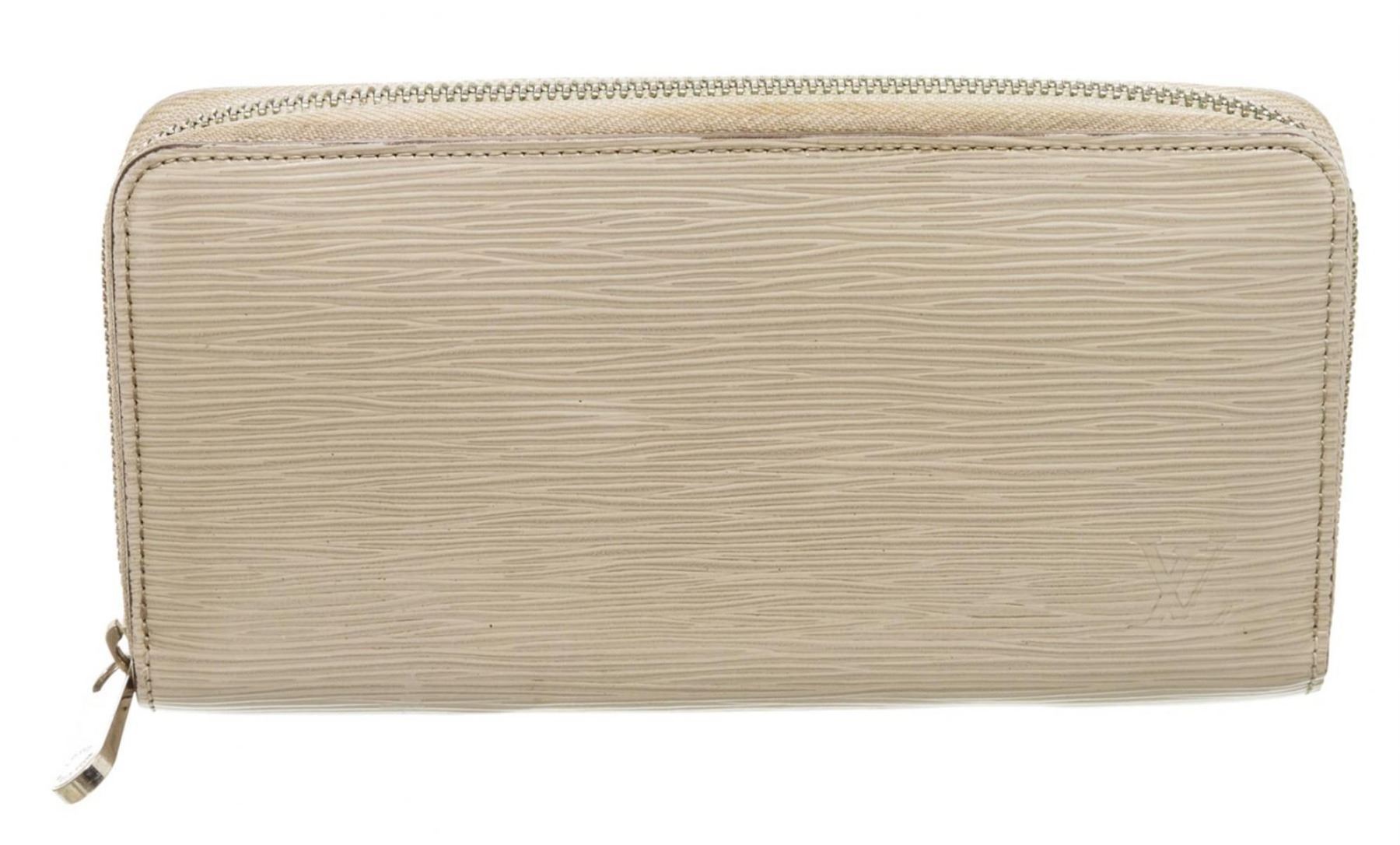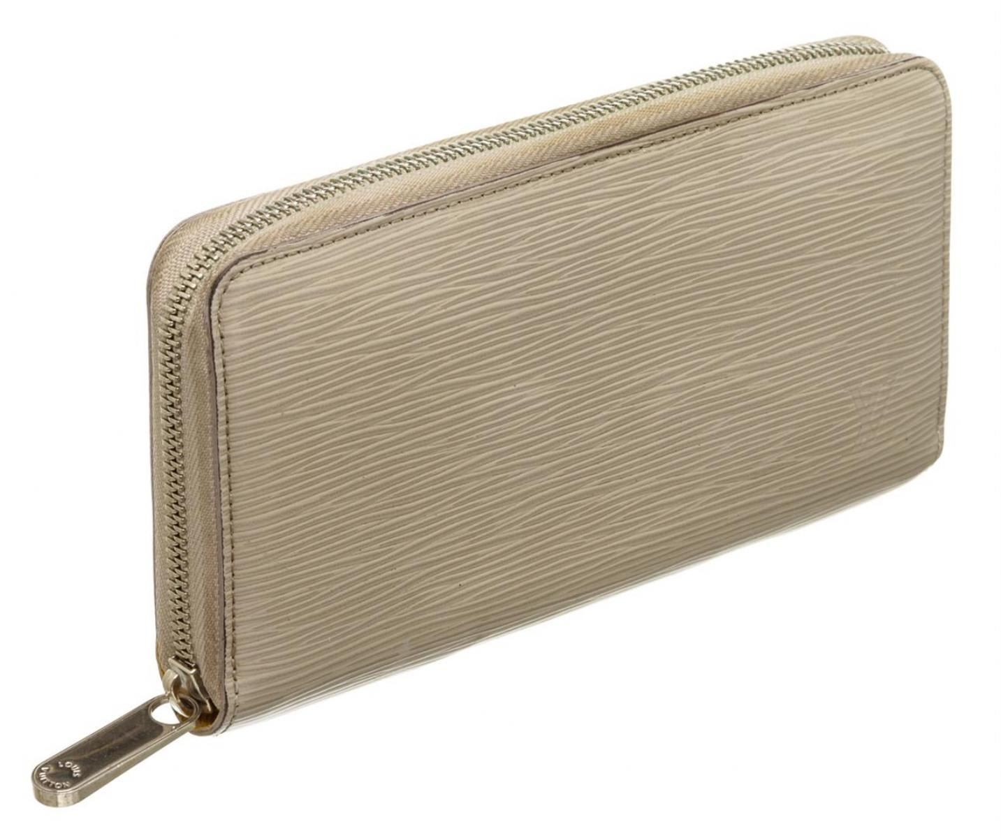 Mauve Epi leather Louis Vuitton Zippy wallet with silver-tone hardware, yellow leather lining, dual bill compartments, single zip pocket at interior wall, ten card slots and zip-around closure.