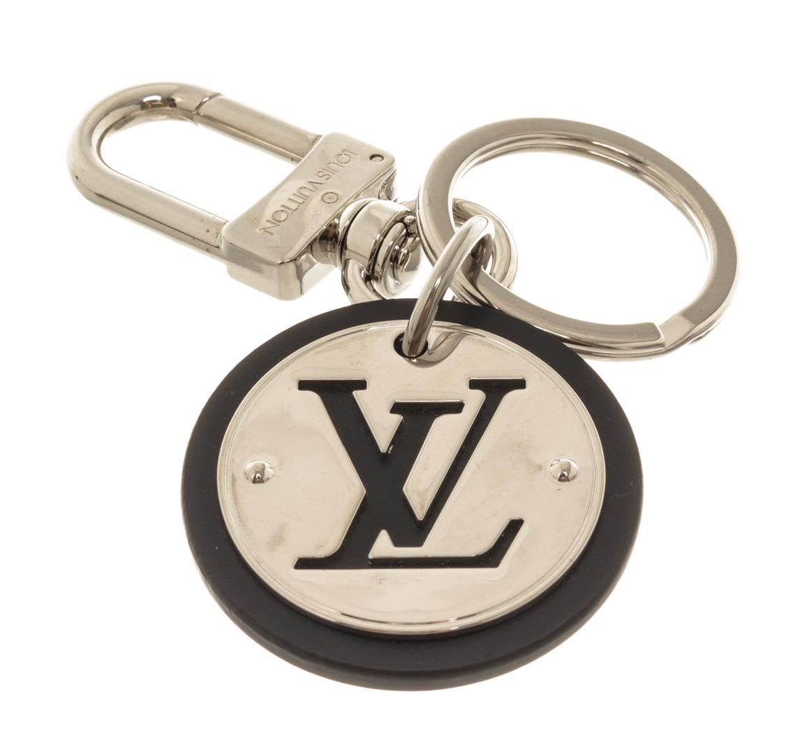 One Louis Vuitton Metal Circle Cut Key Holder. Item is sold AS-IS. All available information is listed in the description and shown in the photo. Louis Vuitton Metal Circle Cut Key Holder with plated black matte leather around the edge, embossed signature engraved on the snap hook and the ring, with silver-tone hardware.