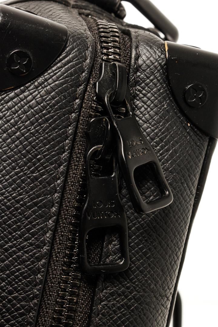 One Louis Vuitton Mini Black Rainbow Taiga Leather Soft trunk Shoulder Bag. Item is sold AS-IS. All available information is listed in the description and shown in the photo. louis vuitton mini black rainbow taiga leather soft trunk shoulder bag with gunmetal-tone hardware, adjustable detachable shoulder strap, front zip-fastening pocket, internal logo patch, full lining, metal corner protectors, zip closure. Depth 2.8 in, Height 4.7 in, Strap 22.4 in, Width 7.5 in / D7.11 x H11.93 x Strap: 56.89 x W19.05 cm
