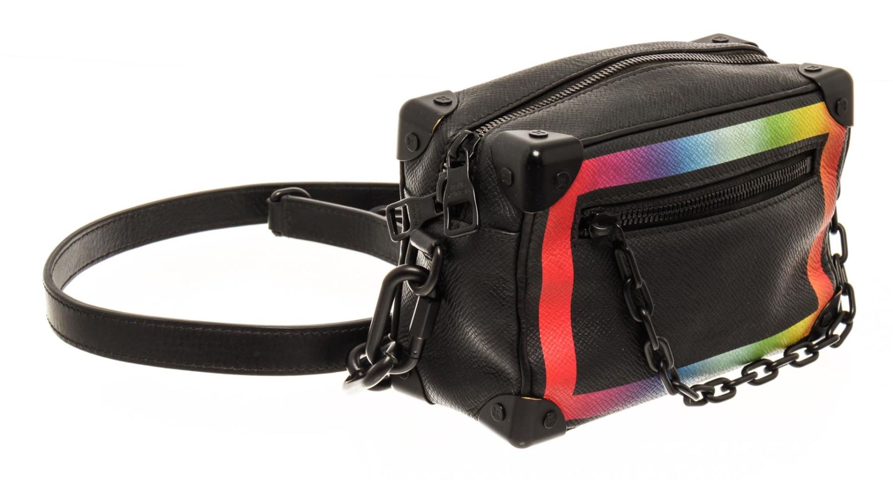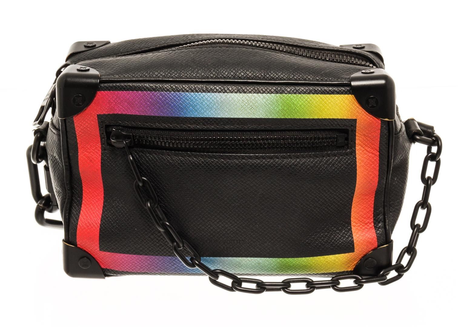 One Louis Vuitton Mini Black Rainbow Taiga Leather Soft trunk Shoulder Bag. Item is sold AS-IS. All available information is listed in the description and shown in the photo. louis vuitton mini black rainbow taiga leather soft trunk shoulder bag with gunmetal-tone hardware, adjustable detachable shoulder strap, front zip-fastening pocket, internal logo patch, full lining, metal corner protectors, zip closure. Depth 2.8 in, Height 4.7 in, Strap 22.4 in, Width 7.5 in / D7.11 x H11.93 x Strap: 56.89 x W19.05 cm