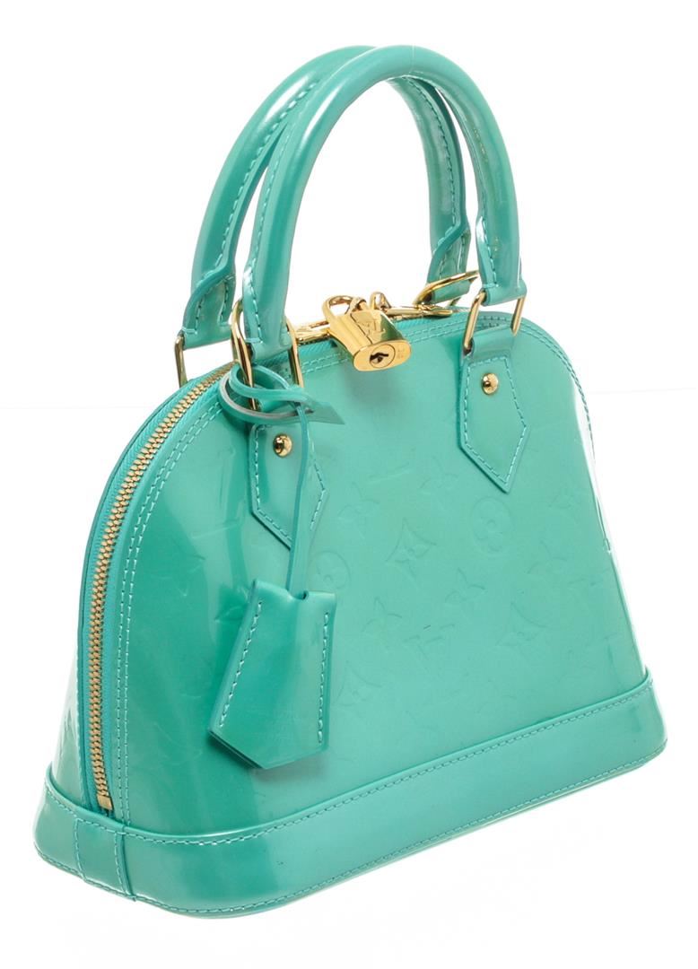 Mint Green monogram Vernis leather Louis Vuitton Alma BB with brass hardware, dual rolled top handles, detachable flap shoulder strap, protective feet at base, tonal woven lining, single slit pocket at interior wall and two-way zip closure at top. Includes clochette, lock and keys. Authentic.