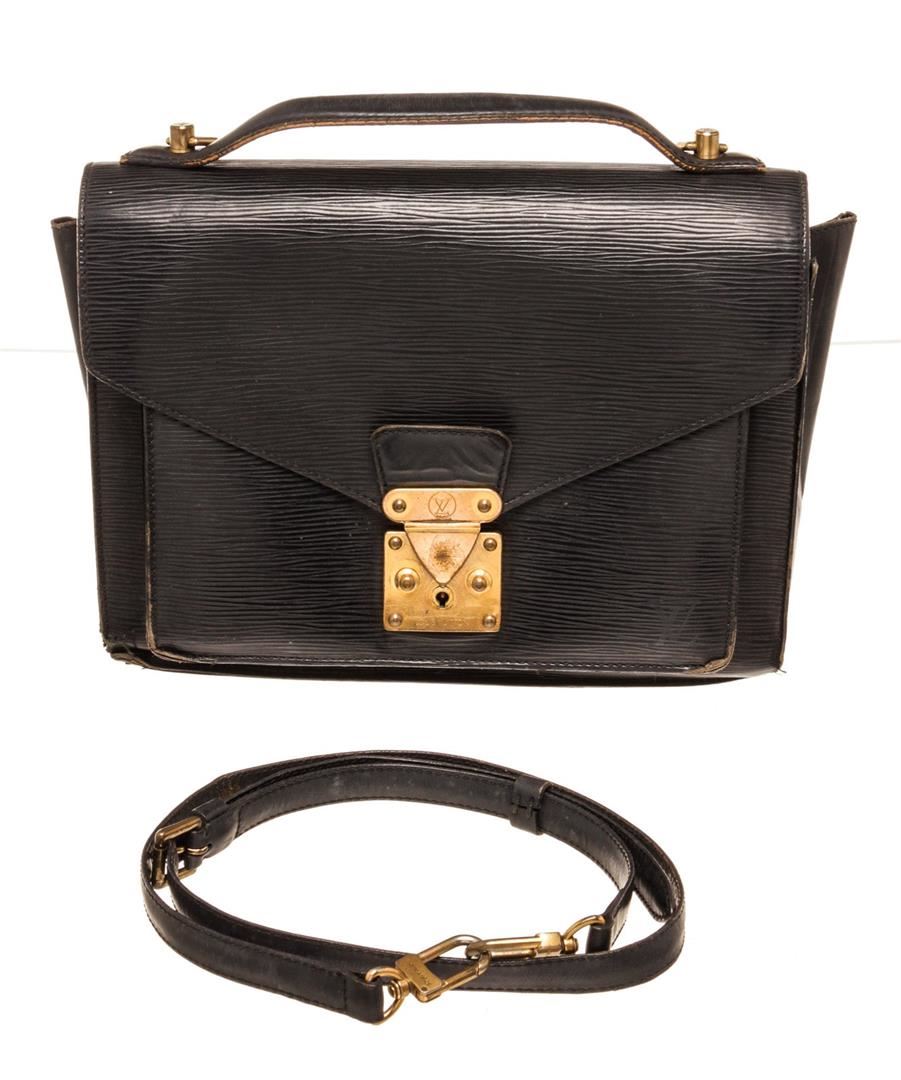 Louis Vuitton Monceau Handbag Black Epi Leather. Brand: Louis Vuitton, Style: Monceau, Type: Handbag, Exterior Color: Black, Exterior Material: Epi Leather, Interior Color: Black, Interior Material: Leather, Interior Pockets: one pouch, one zip, Closure: Push closure, Handle/Strap Type: Top handle, Length: 11", Width: 3", Height: 8", Handle Drop: 2". Condition: Heavy corner/edge wear and exterior scratching. Additional Information: GHW. Item is sold AS-IS and all information pertaining to this lot is available in the photos or this description.