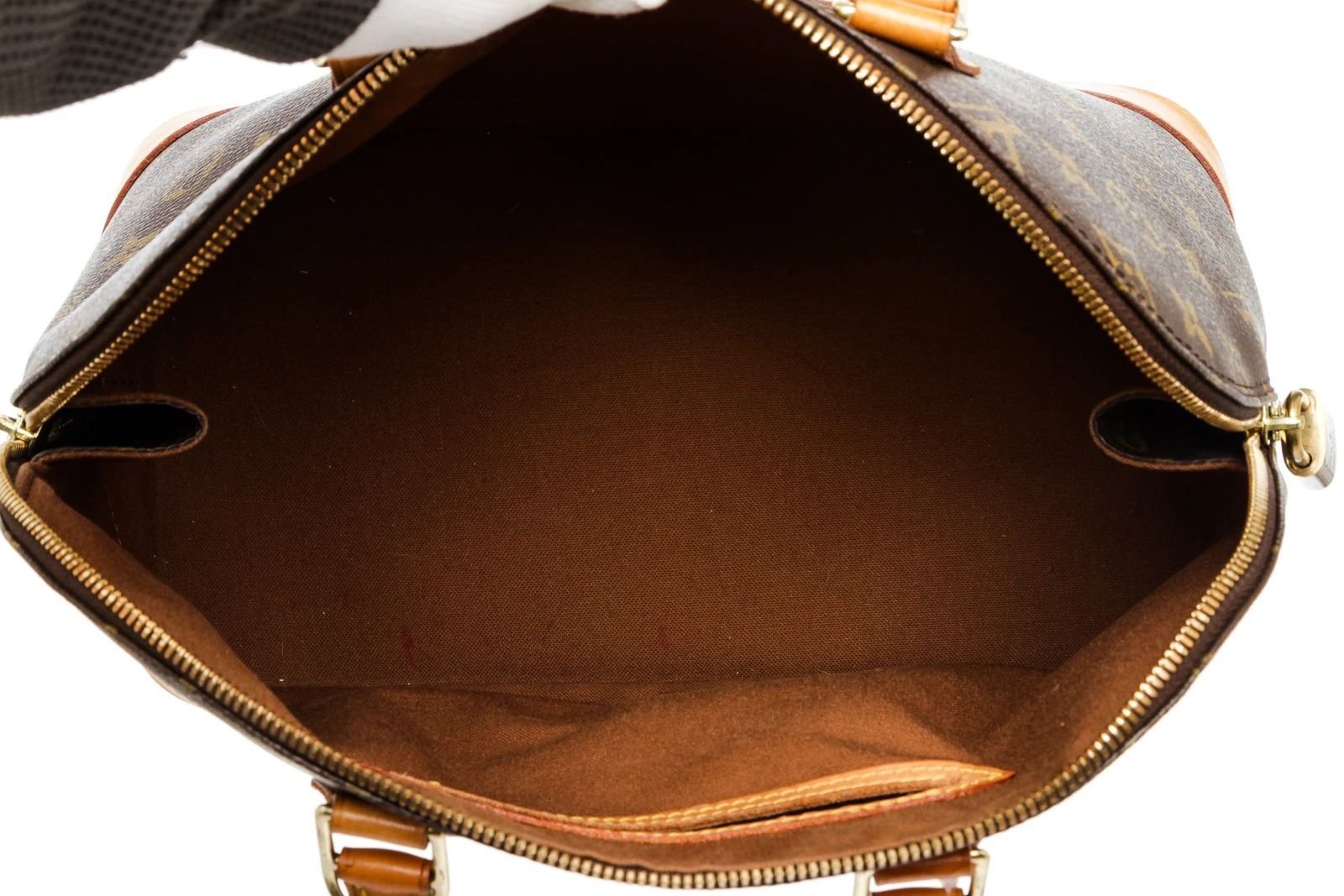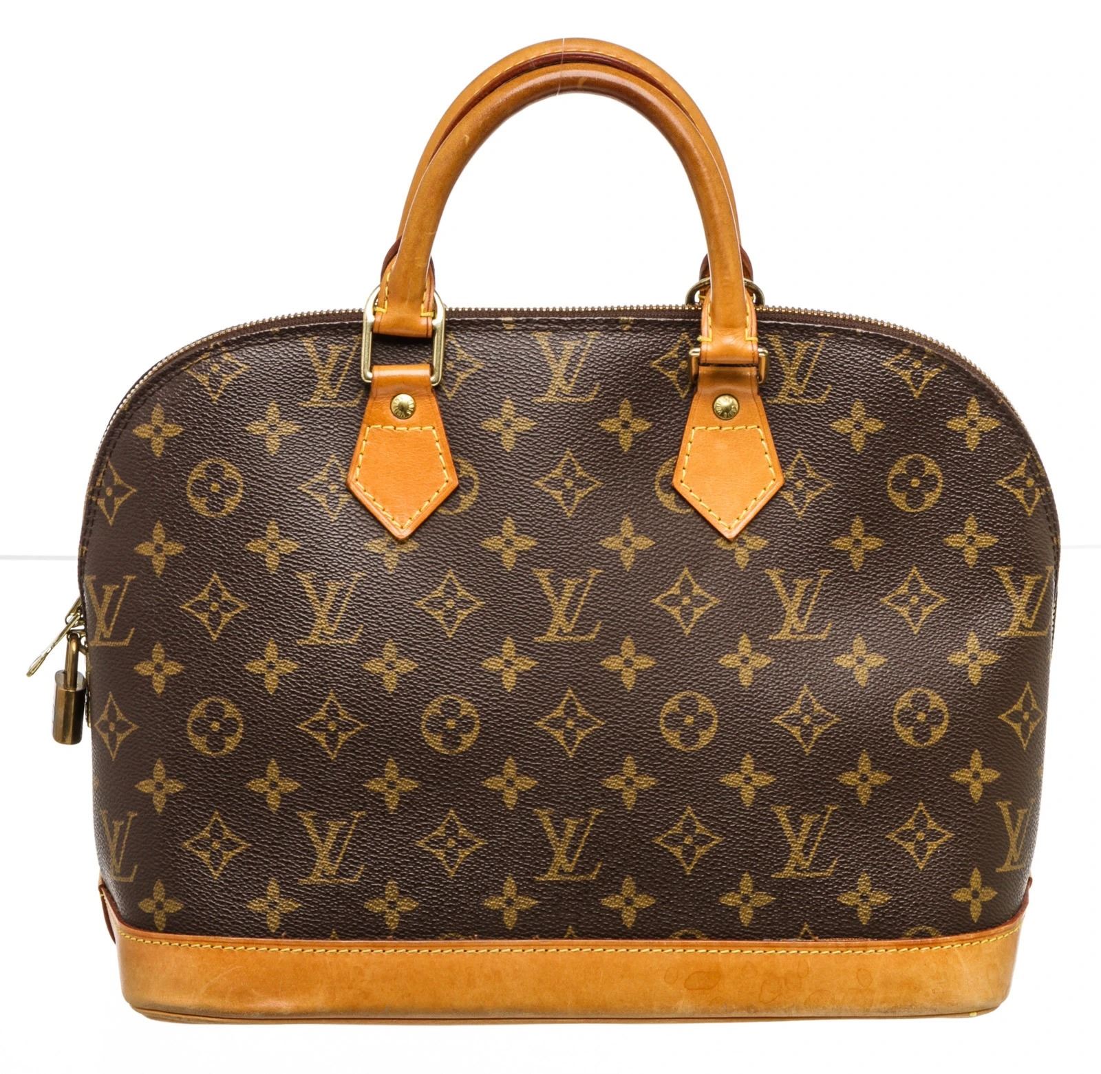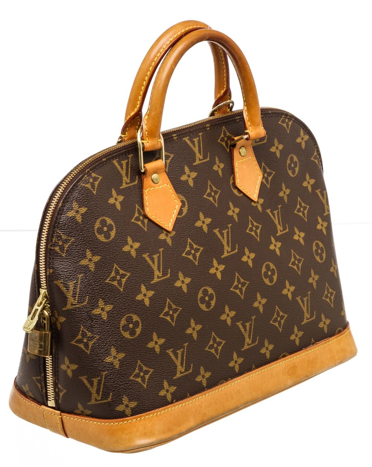 Brown monogram coated canvas Louis Vuitton Alma with brass hardware, tan vachetta leather trim, dual rolled top handles, brown canvas lining, single pocket at interior wall and two-way zip closure at top.