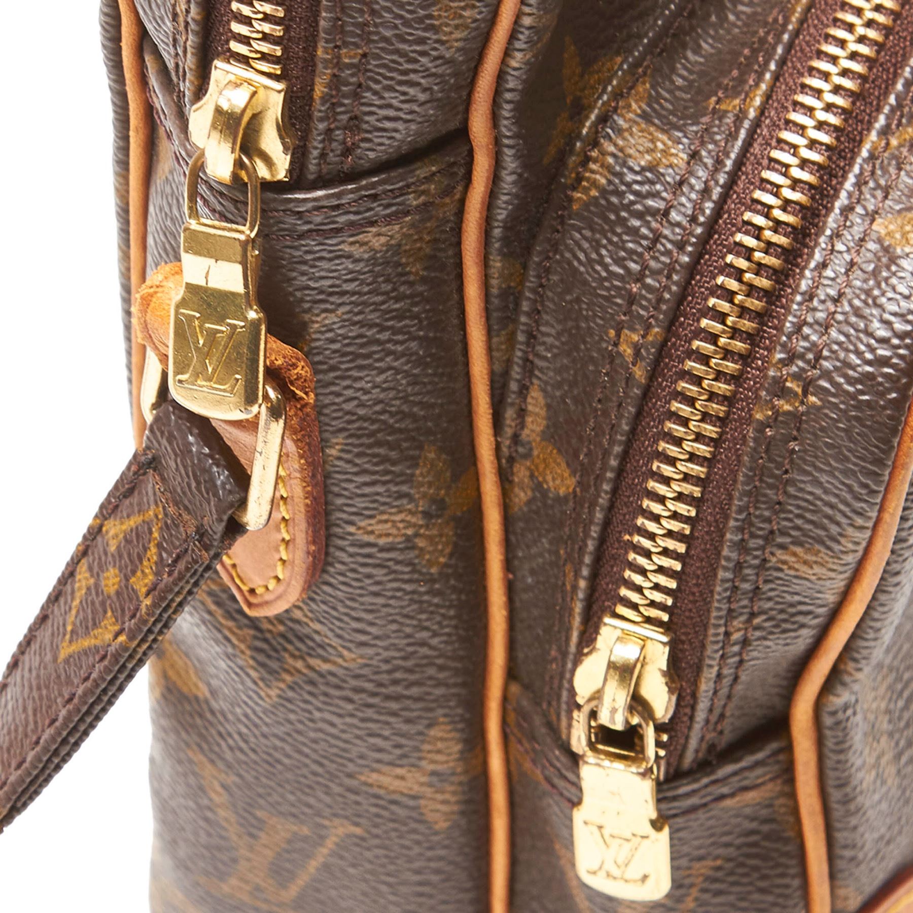 The Amazone features a monogram canvas body, a front exterior zip pocket, an adjustable shoulder strap, a top zip closure, and an interior slip pocket. Canvas x Monogram Canvas x Leather x Vachetta Leather Brown Exterior corners are worn. Exterior front is stained with water mark. Exterior back is stained. Zipper is scratched. Size: 21 x 16 x 7.5 Card: NO. Louis Vuitton pieces do not come with an authenticity card—please refer to the production date code within the bag for its age and as an authenticity reference. Made in: France