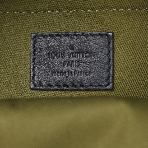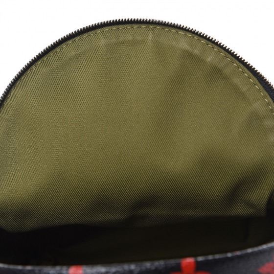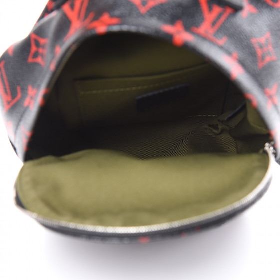 Mini backpack features a sturdy body crafted of monogram in red and black coated canvas with black calfskin trim. The backpack features a front zipped pocket, black cowhide leather including a top handle and adjustable shoulder straps. The top zipper opens to a green nylon fabric with a patch pocket.