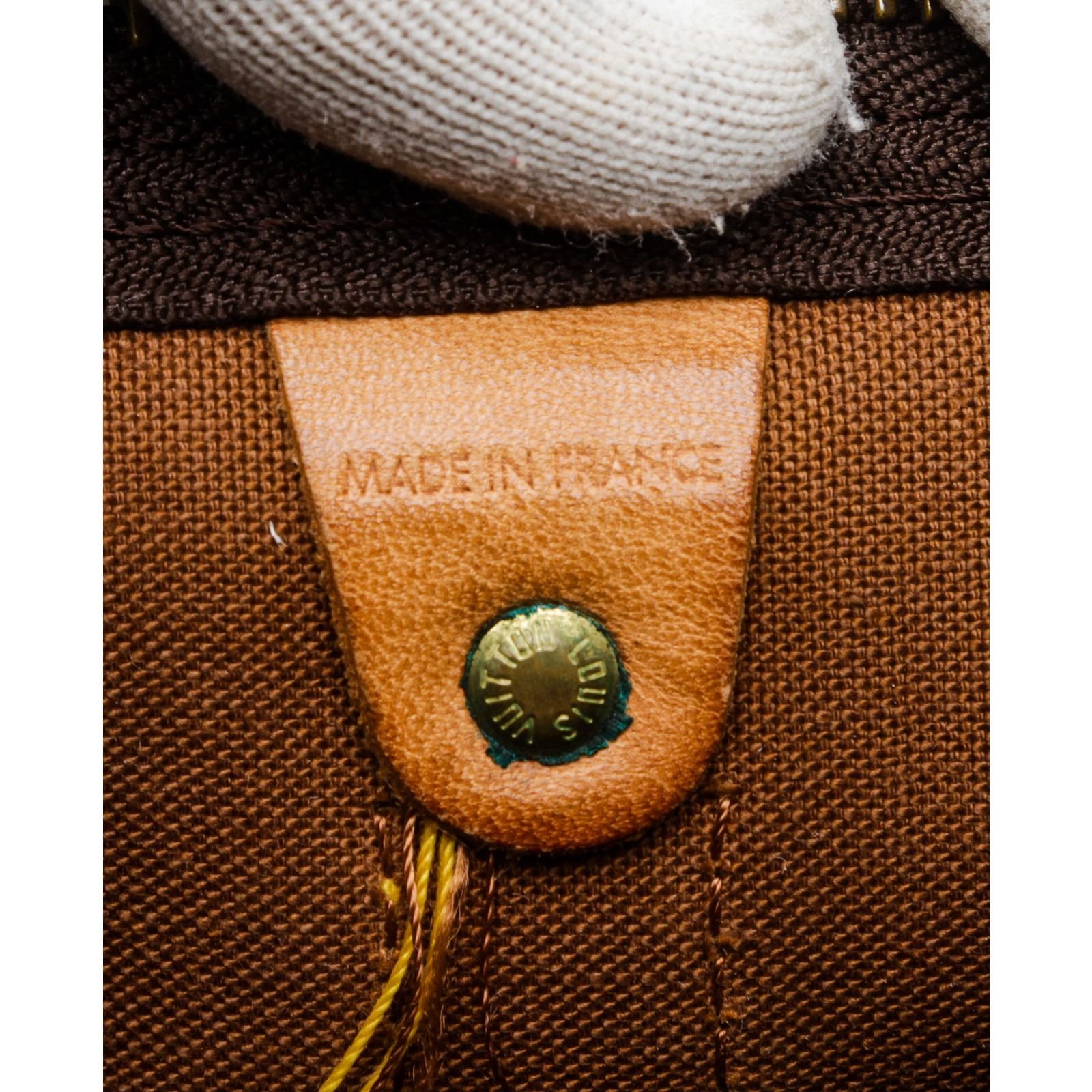 Brown and tan monogram coated canvas Louis Vuitton Keepall Bandouliere 45 with brass hardware, tan vachetta leather trim, dual rolled top handle, brown canvas lining and two-way zip closure at top. Detachable shoulder strap NOT included.