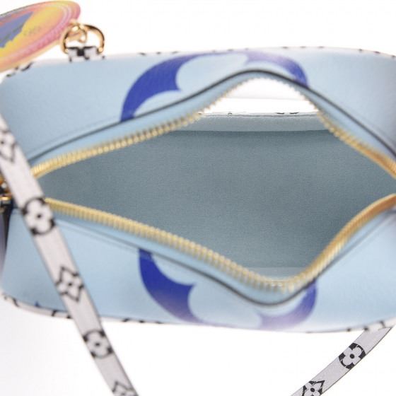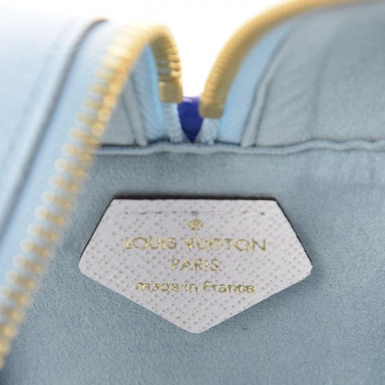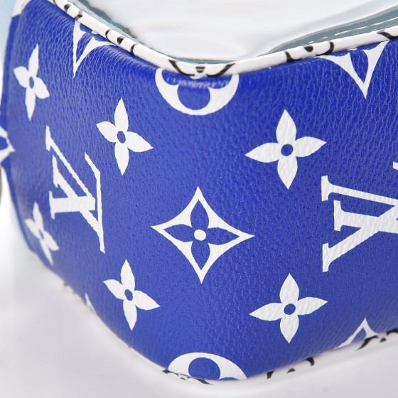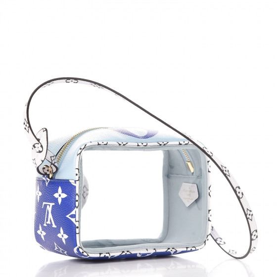 Blue pouch is perfectly suited for a day in the city or by the sea side. Oversized and miniature monogram print cover the coated canvas, and transparent PVC sides are featured at the front and back. The top unzips to a microfiber lined interior, best suited for small essentials. A small looping strap and a mini name tag make this versatile accessory complete.