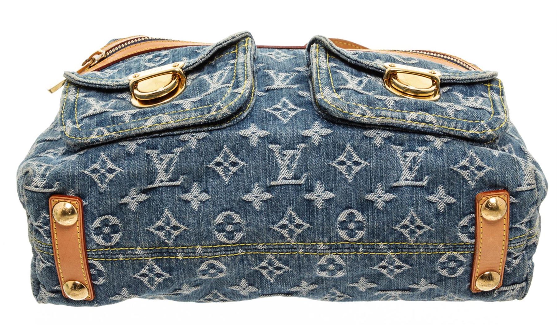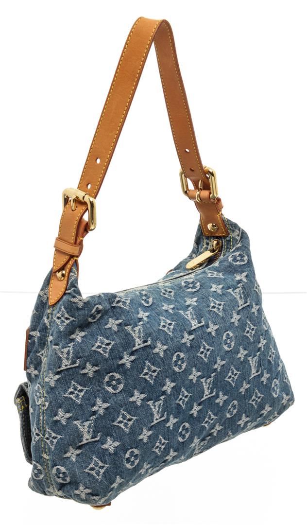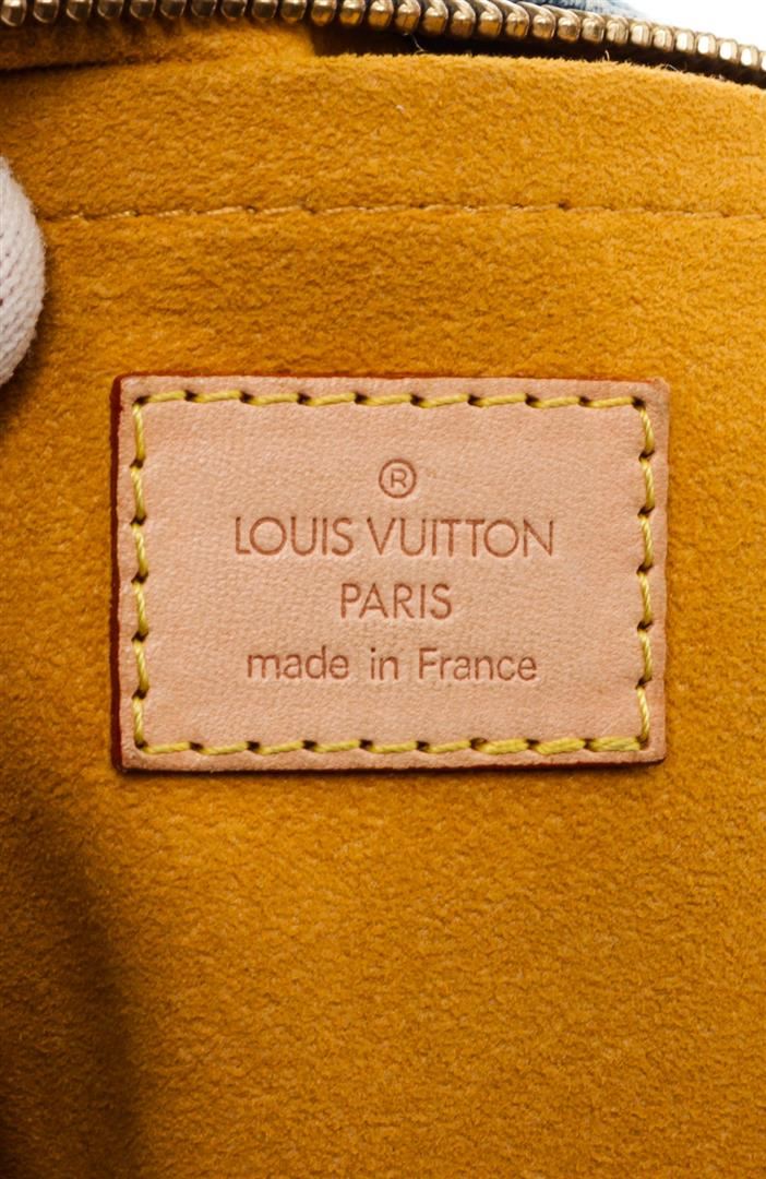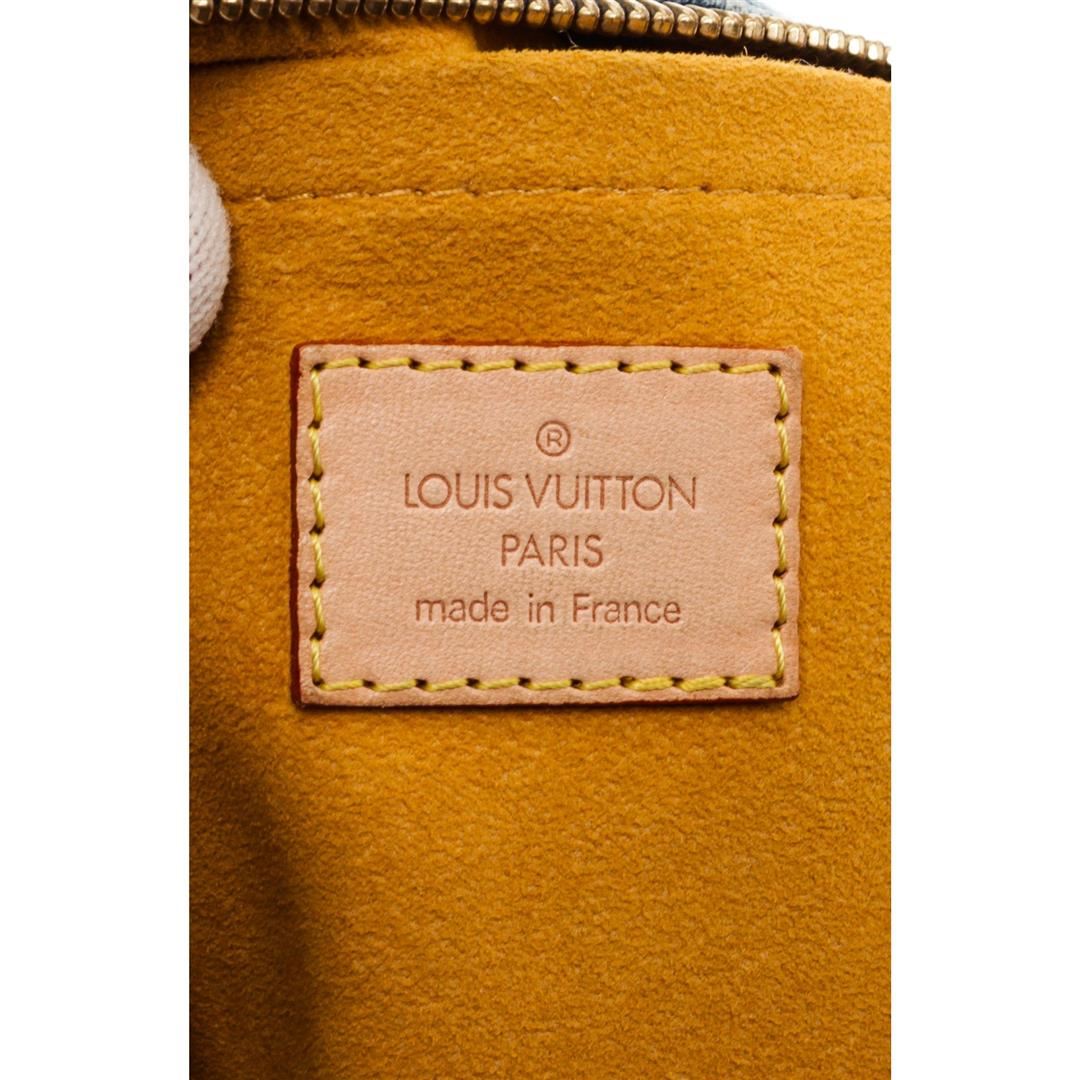 Demin monogram Louis Vuitton Baggy PM shoulder bag with tan vachetta leather trim, gold-tone hardware, single adjustable leather shoulder strap, two exterior snap pockets and single exterior zipper pocket, alcantara microfiber lining and interior zip pocket, zipper closure along top of bag.