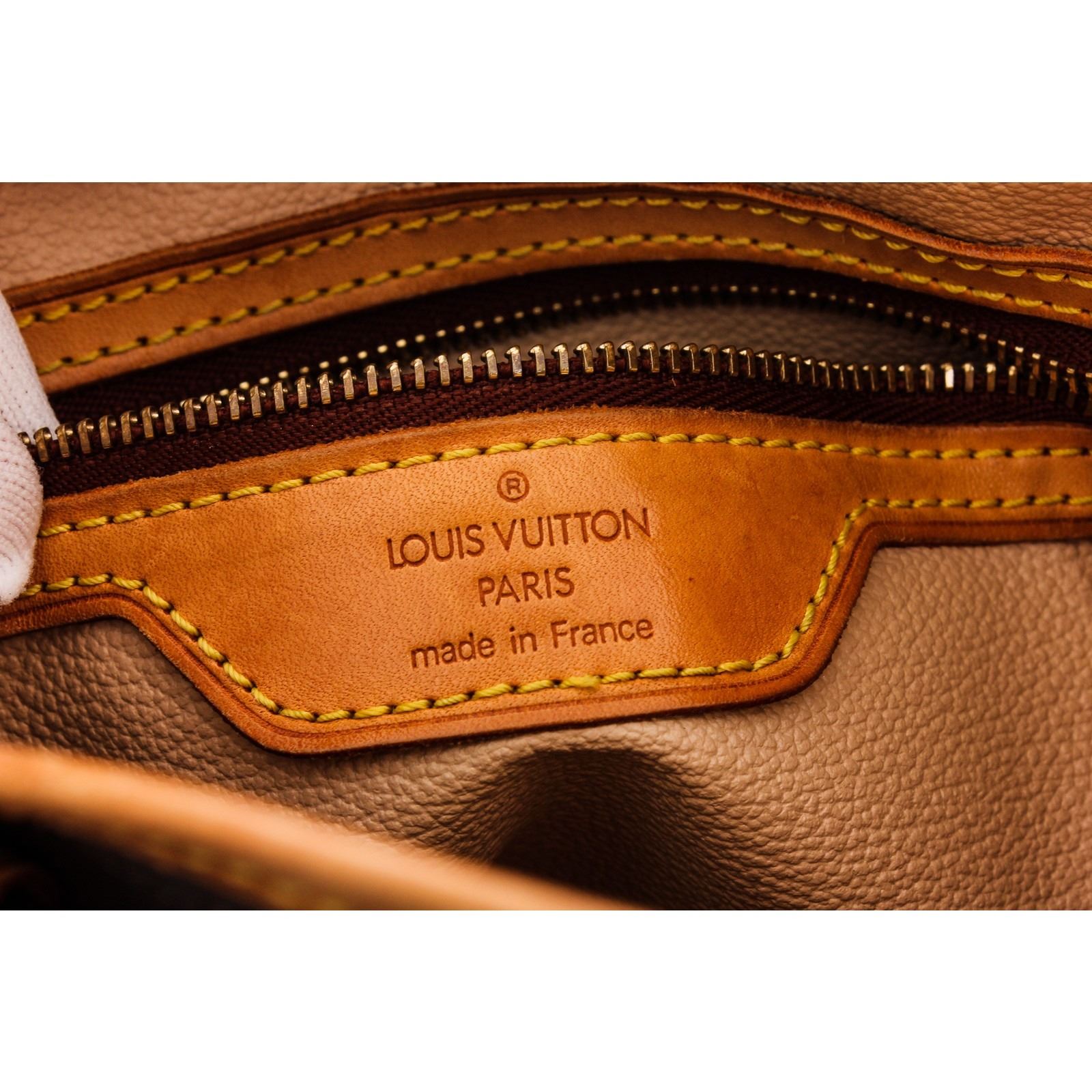 Brown and tan monogram coated canvas Louis Vuitton Petit Bucket bag with brass hardware, tan vachetta leather accents throughout, dual adjustable shoulder straps, beige coated lining, dual pockets at interior walls; one with zip closure and open top.