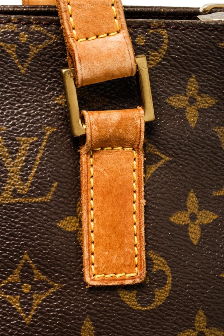 One Louis Vuitton Monogram Cabas Piano Handbag. Item is sold AS-IS. All available information is listed in the description and shown in the photo. Louis Vuitton Monogram Cabas Piano handbag with brown coated canvas exterior, brown fabric lining, contrasting vachetta leather top handles and bottom, gold-tone hardware, zipper closure, and one main compartment with one zip pocket.