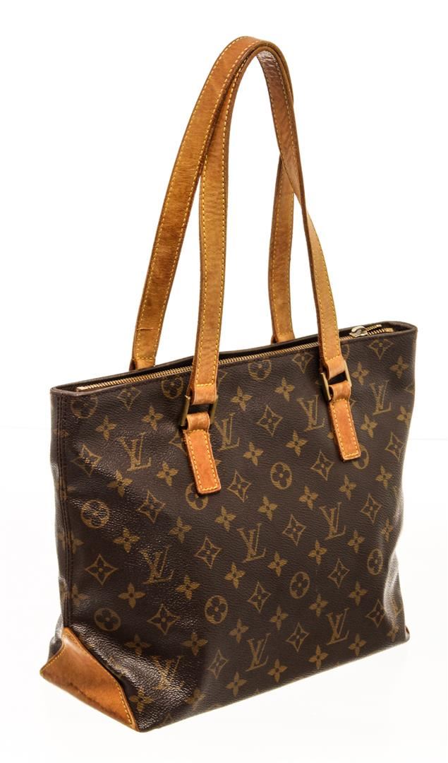One Louis Vuitton Monogram Cabas Piano Handbag. Item is sold AS-IS. All available information is listed in the description and shown in the photo. Louis Vuitton Monogram Cabas Piano handbag with brown coated canvas exterior, brown fabric lining, contrasting vachetta leather top handles and bottom, gold-tone hardware, zipper closure, and one main compartment with one zip pocket.