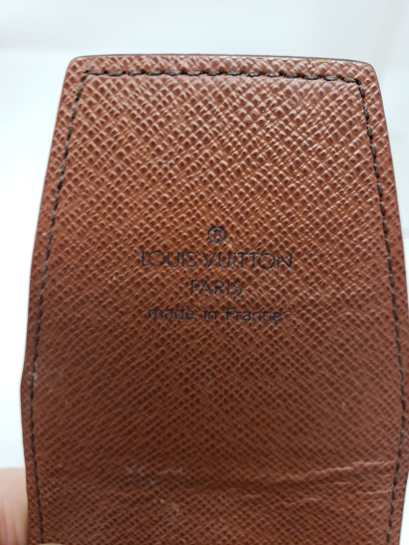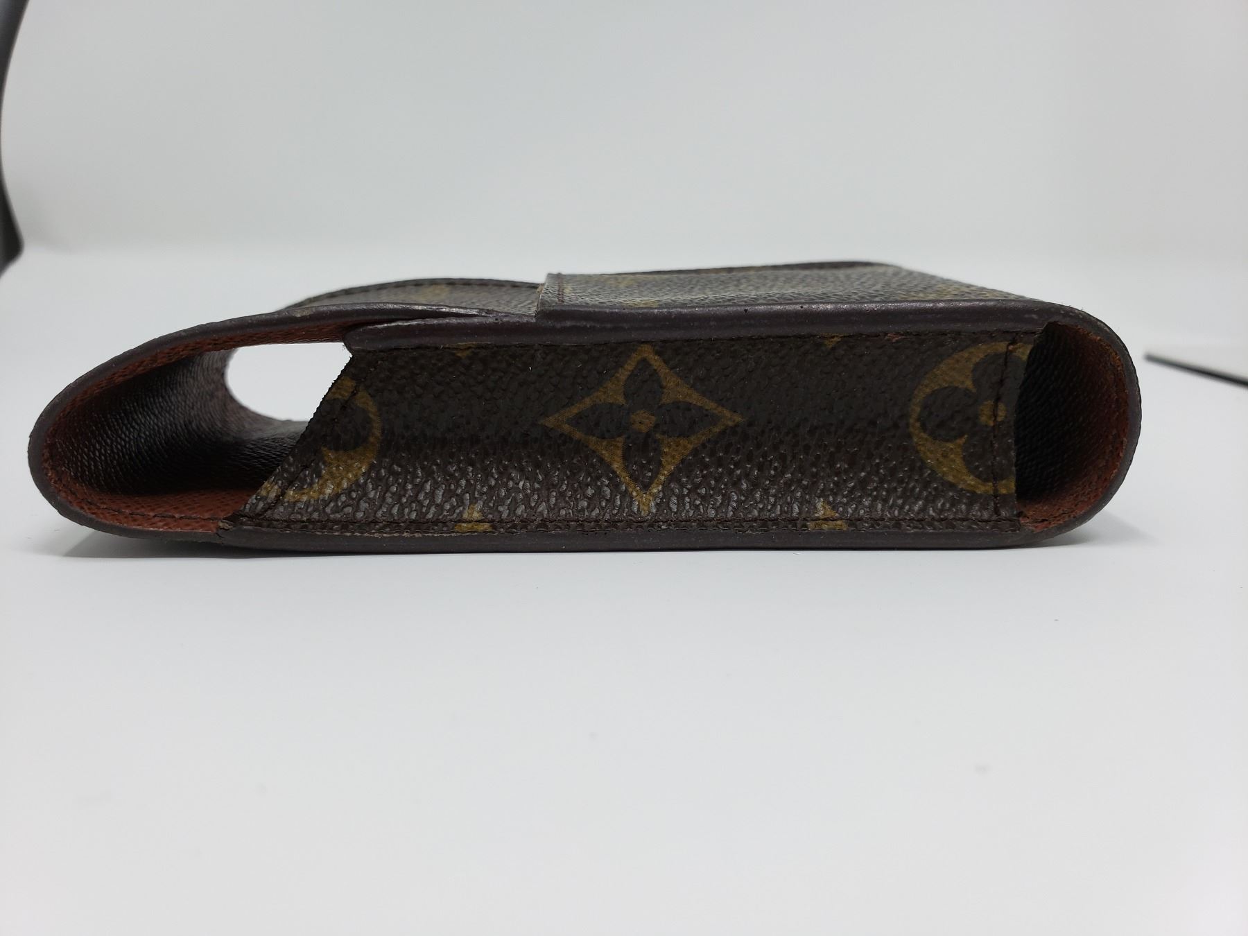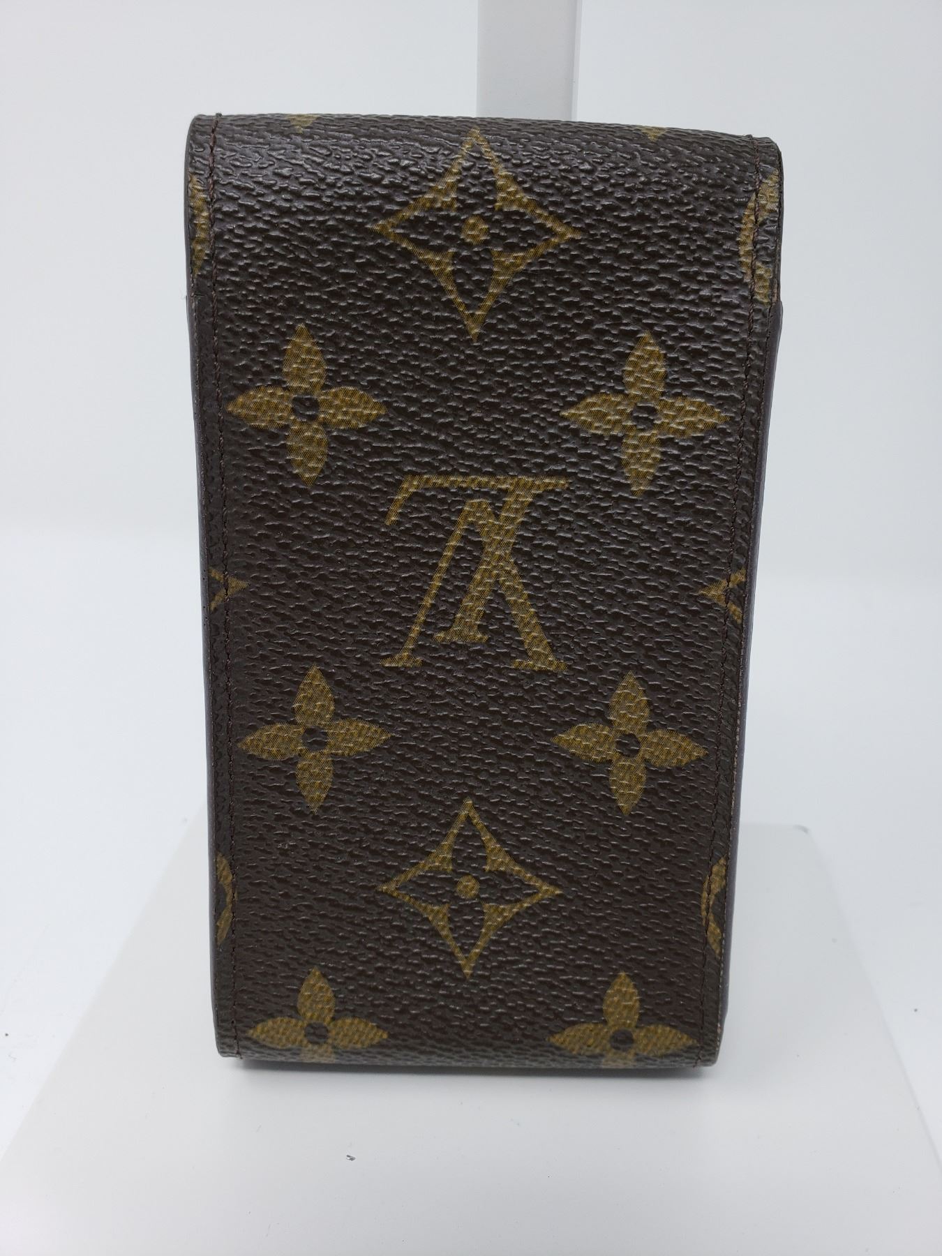 Description: made of Louis Vuitton monogram canvas with a scratch resistant terracotta colored cross grain interior that closes with a flap. This is a large cell phone case that is spacious enough for any of the smart phones and will adjust with the top flap. It has optional holes allowing it to attach to your belt.