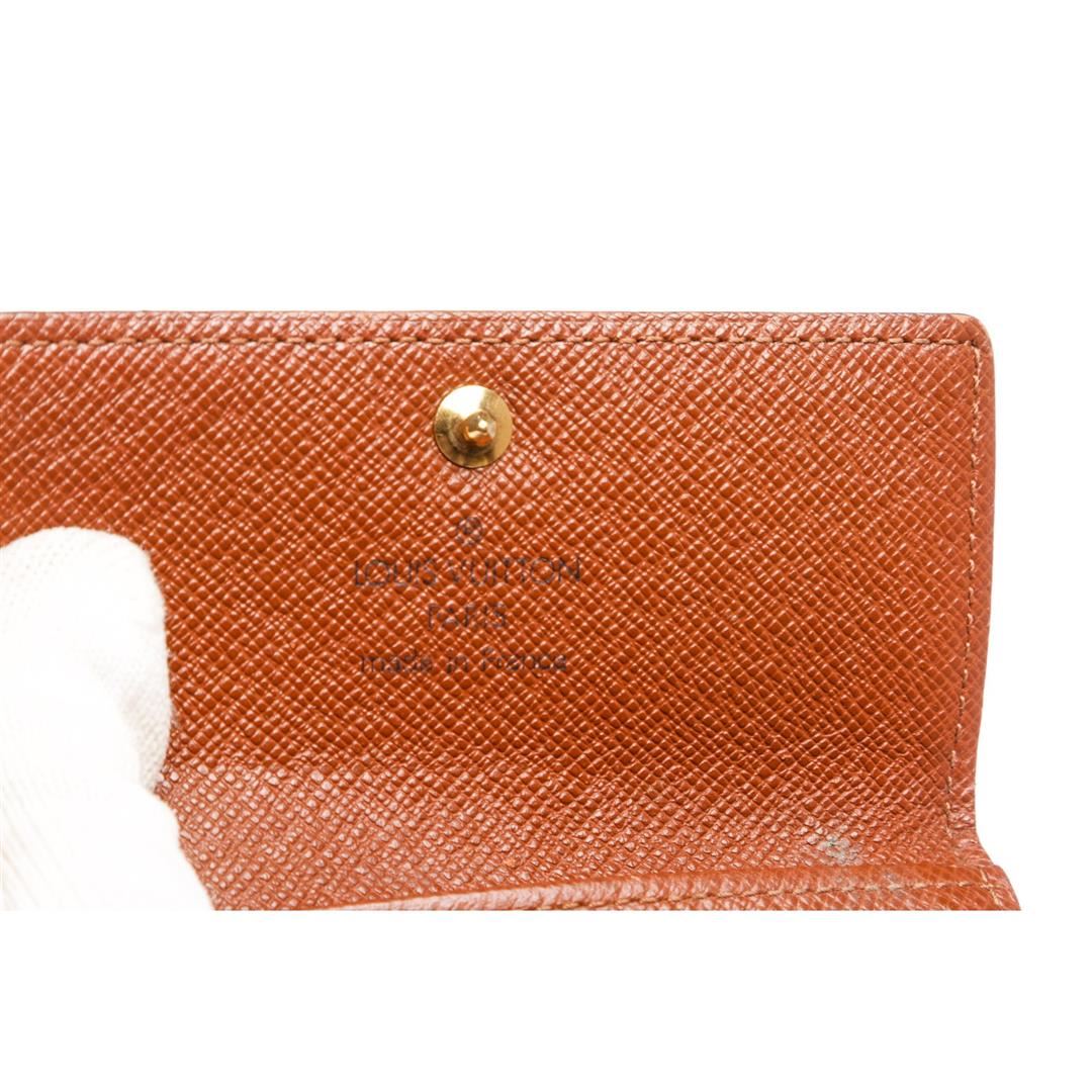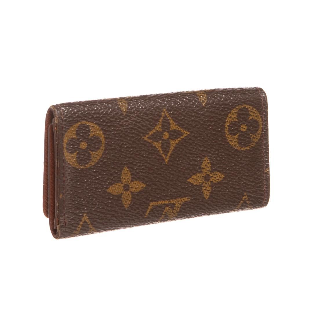 Men's brown and tan monogram coated canvas Louis Vuitton 4 Key Holder with brass hardware, brown leather lining featuring four key ring hooks and snap closure at front flap Item is pre-owned.