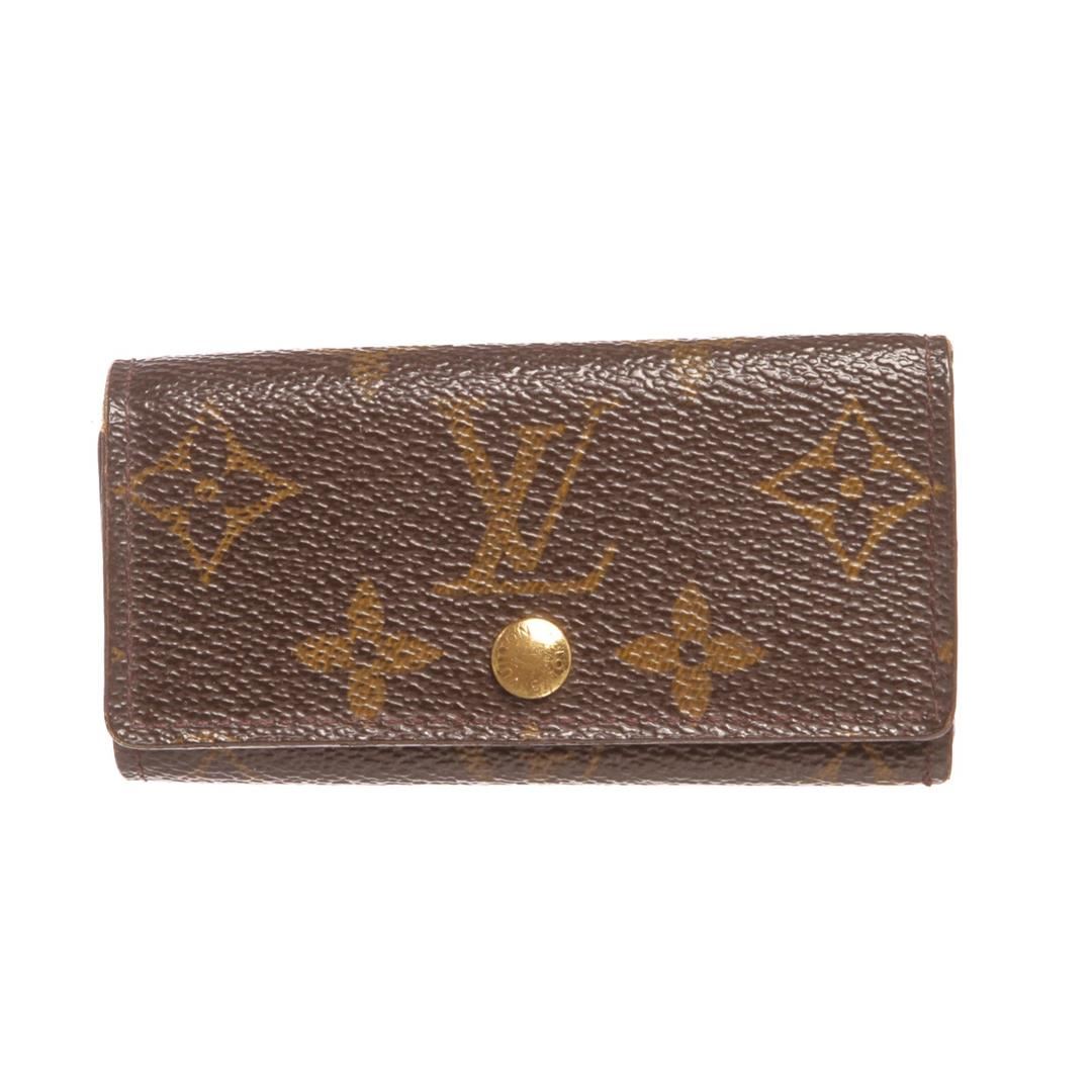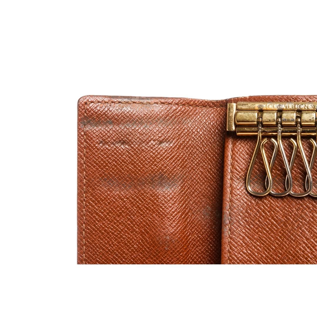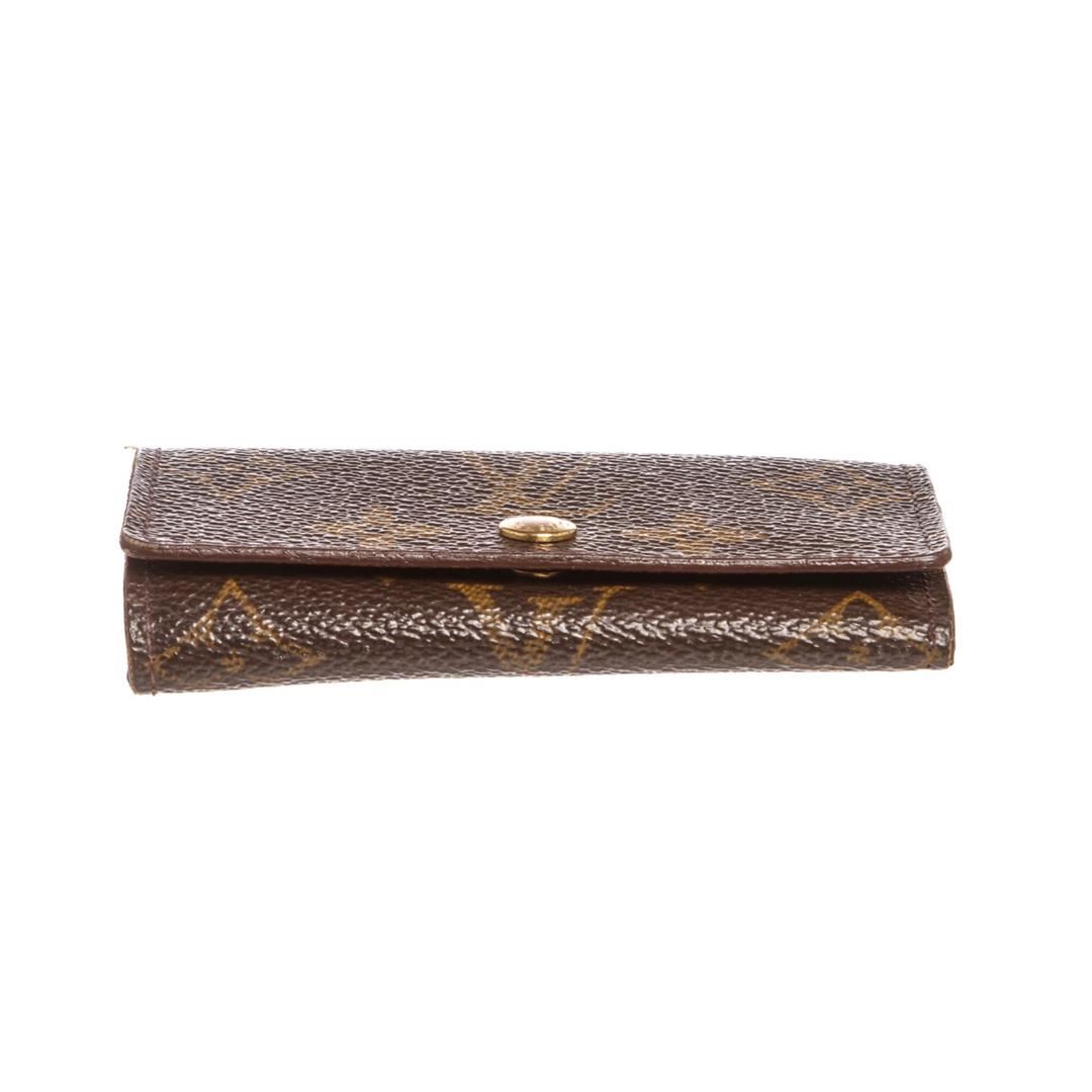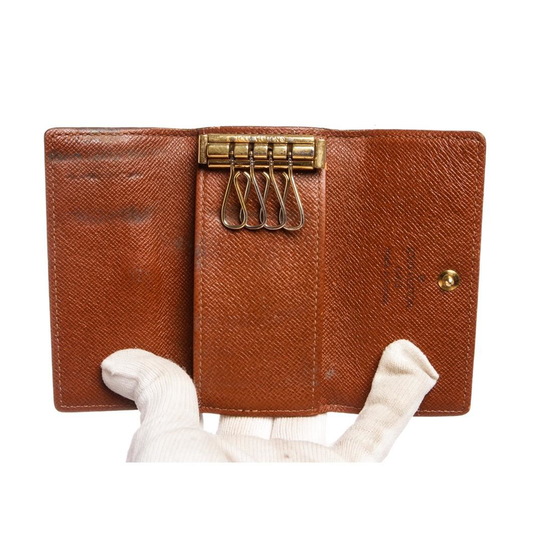 Men's brown and tan monogram coated canvas Louis Vuitton 4 Key Holder with brass hardware, brown leather lining featuring four key ring hooks and snap closure at front flap Item is pre-owned.
