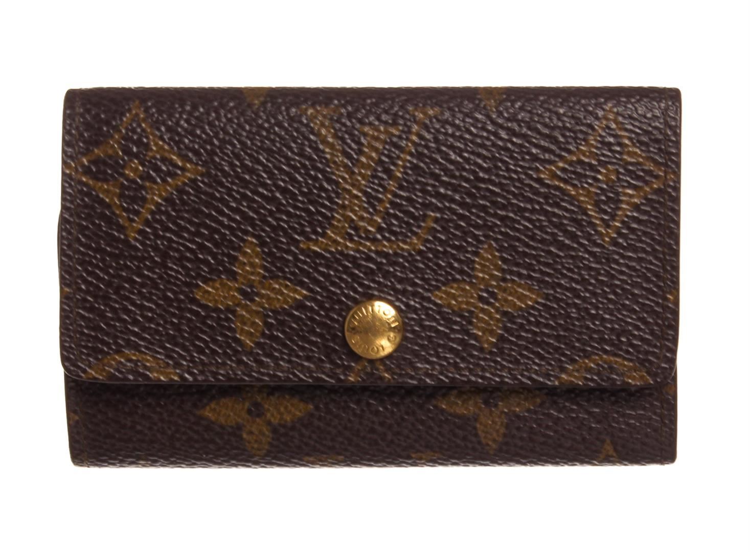 Brown and tan monogram coated canvas Louis Vuitton key holder with brass hardware, brown cross grain leather lining, six key rings and snap closure at front flap.