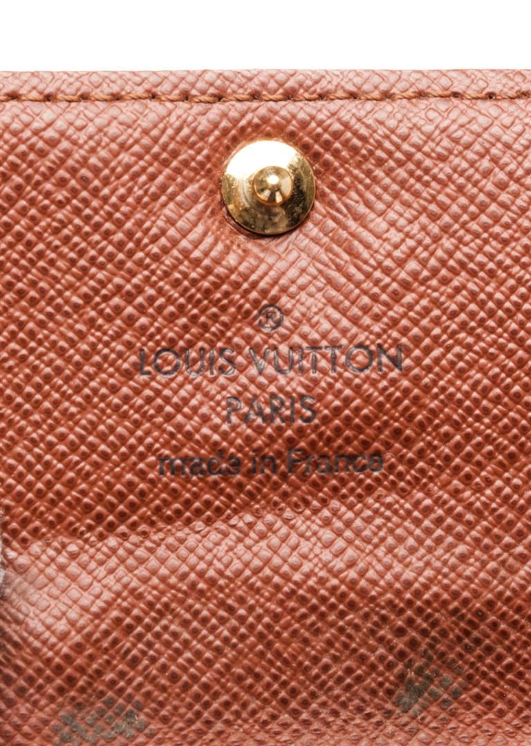Brown and tan monogram coated canvas Louis Vuitton key holder with brass hardware, brown cross grain leather lining, six key rings and snap closure at front flap.