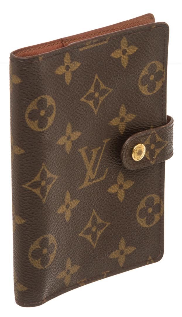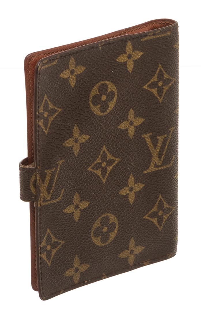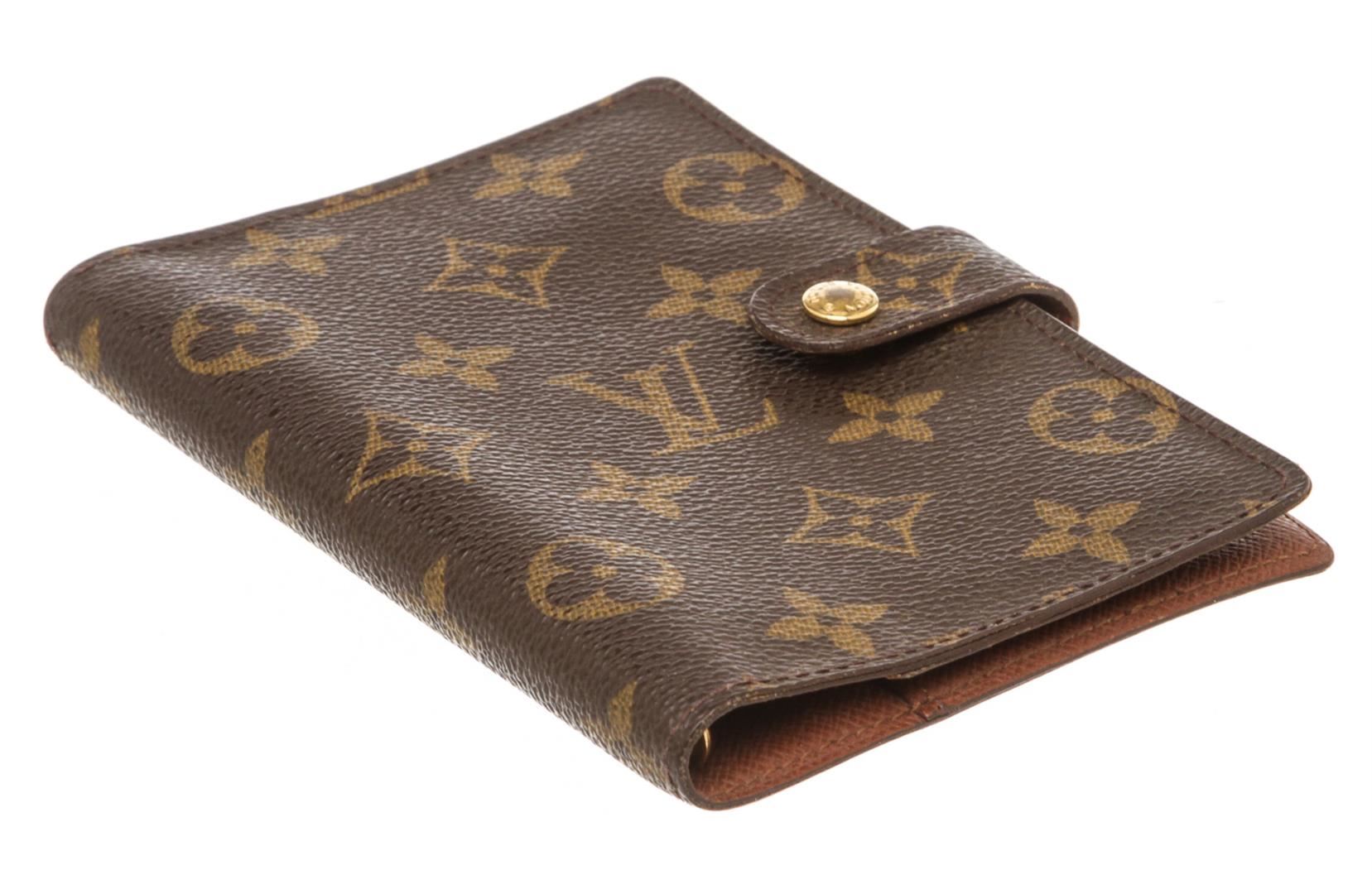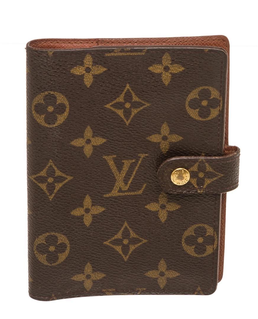 One Louis Vuitton Monogram Canvas Leather Agenda PM Cover. Brown and tan coated canvas Louis Vuitton Monogram small agenda cover with gold-tone metal hardware, leather interior lining, slit pockets and card slots at interior, snap closure at front and brand stamp at interior.