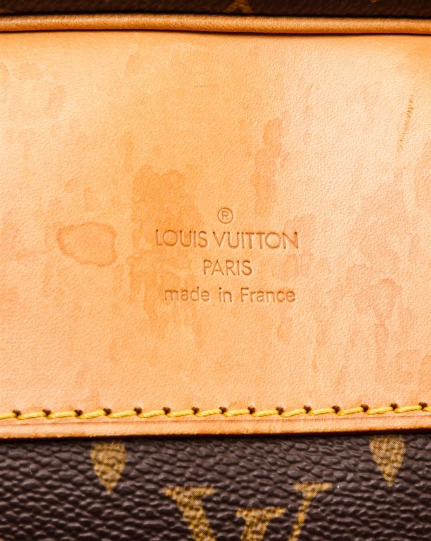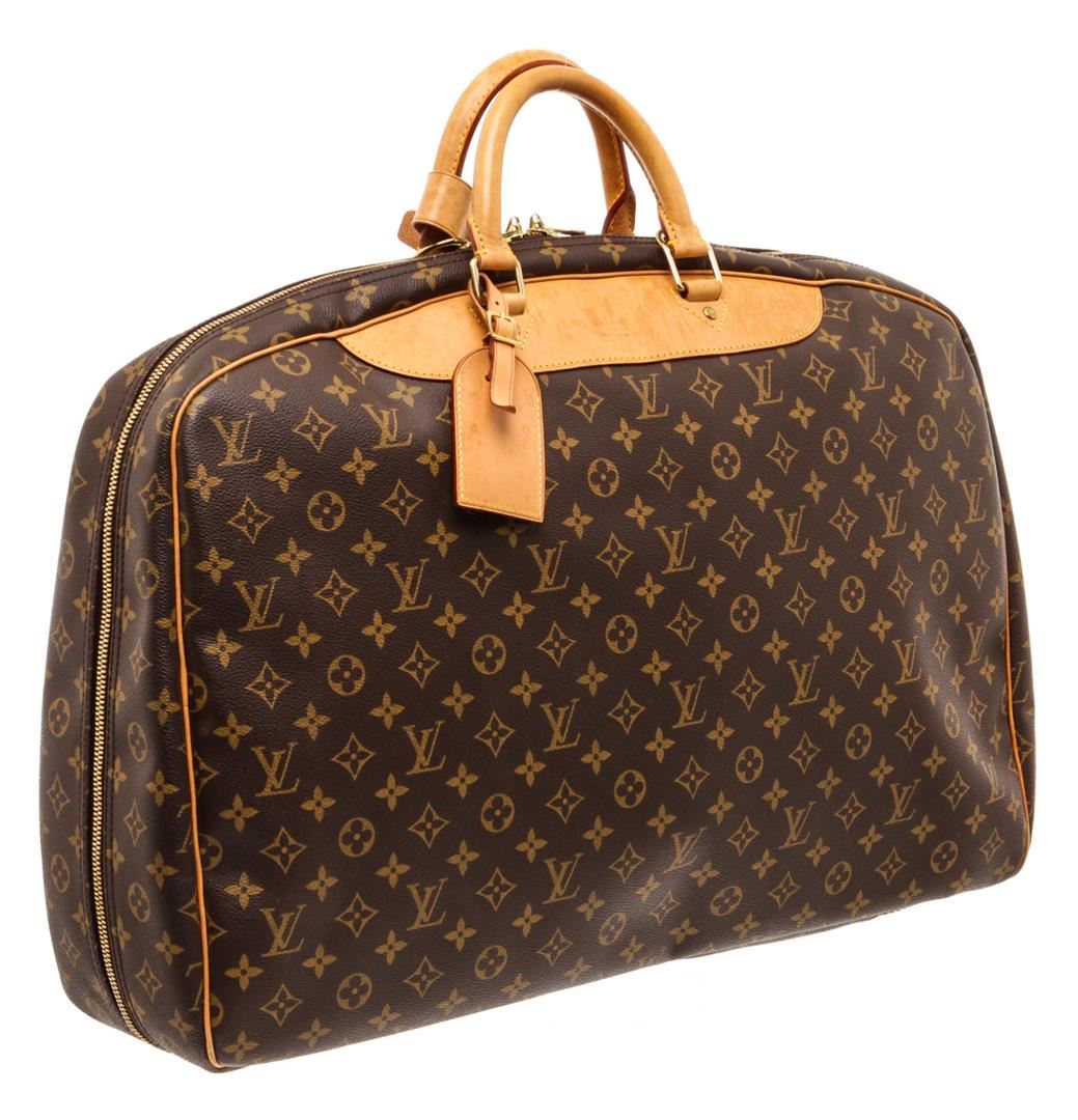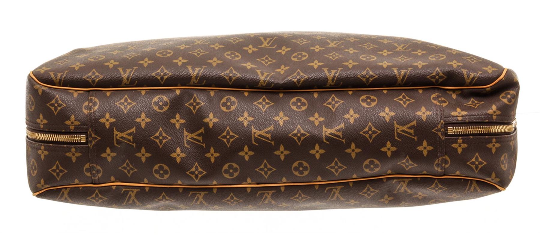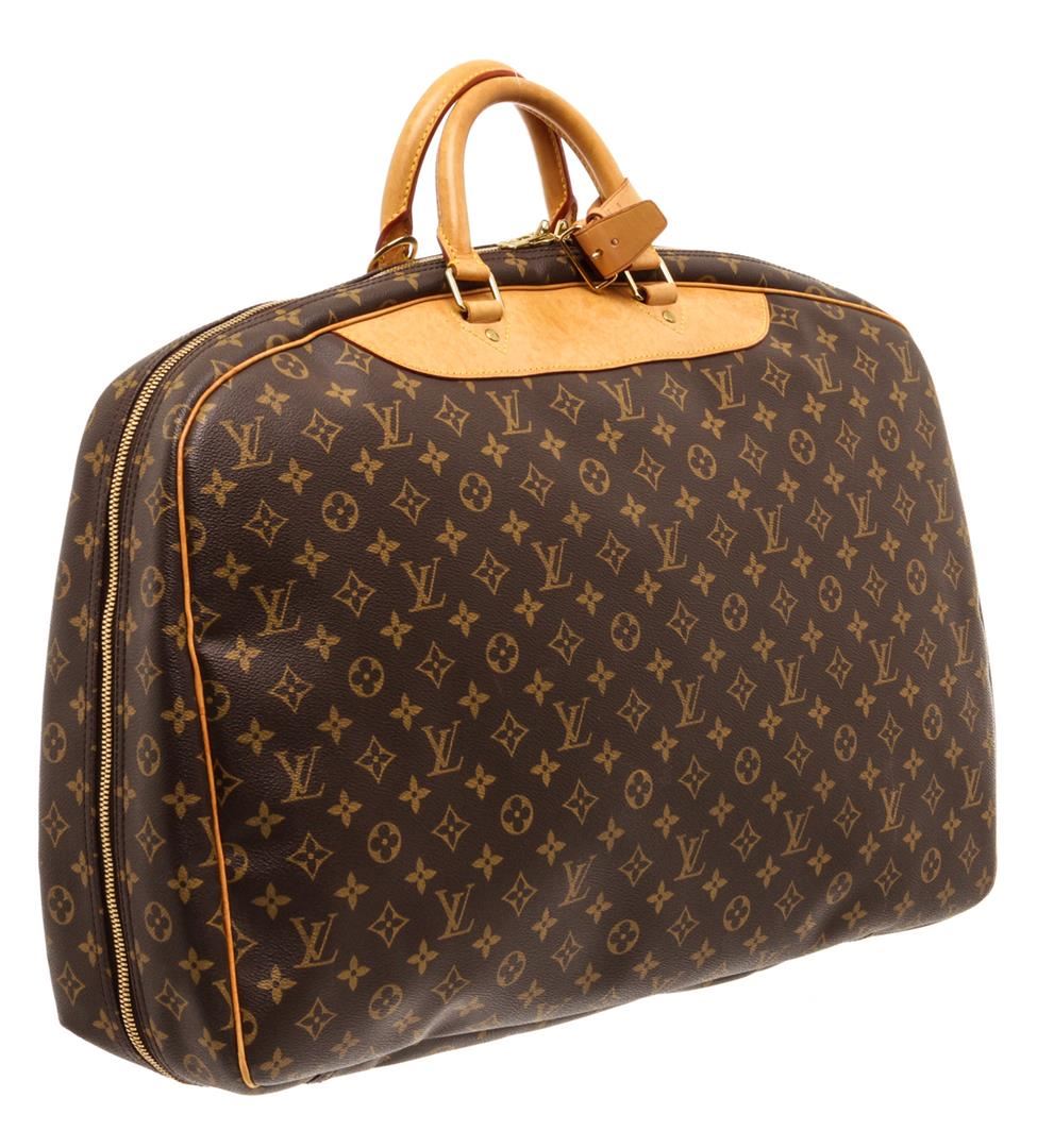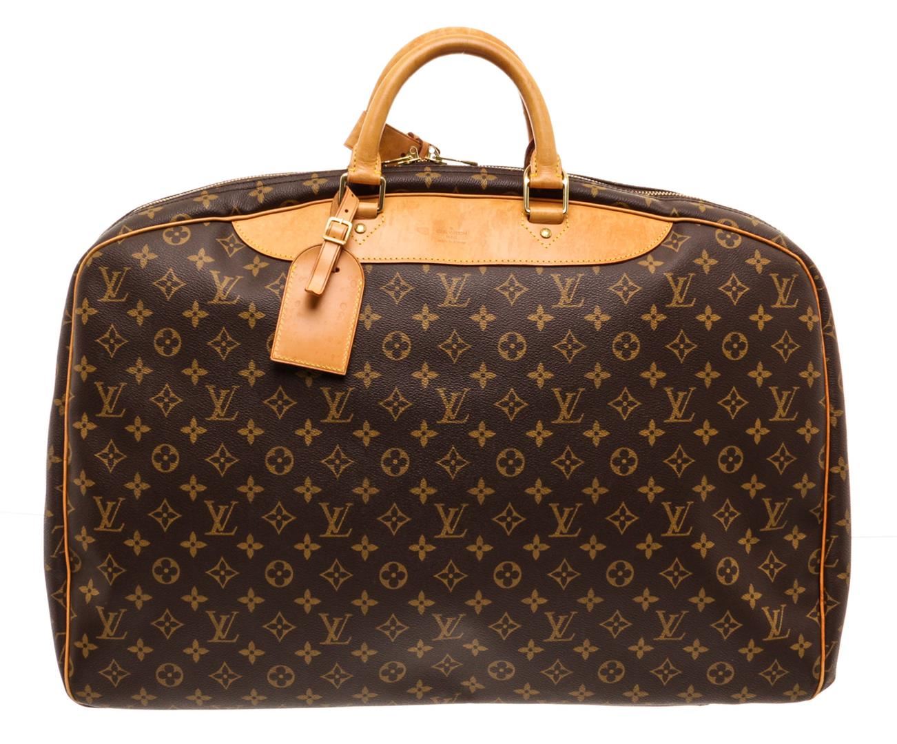 Brown and tan monogram coated canvas Louis Vuitton Alize luggage with brass hardware, tan vachetta leather trim, luggage tag, detachable woven shoulder strap, dual rolled top handles, beige canvas lining, dual interior compartments, single open pocket at interior wall and dual zip closures at top.