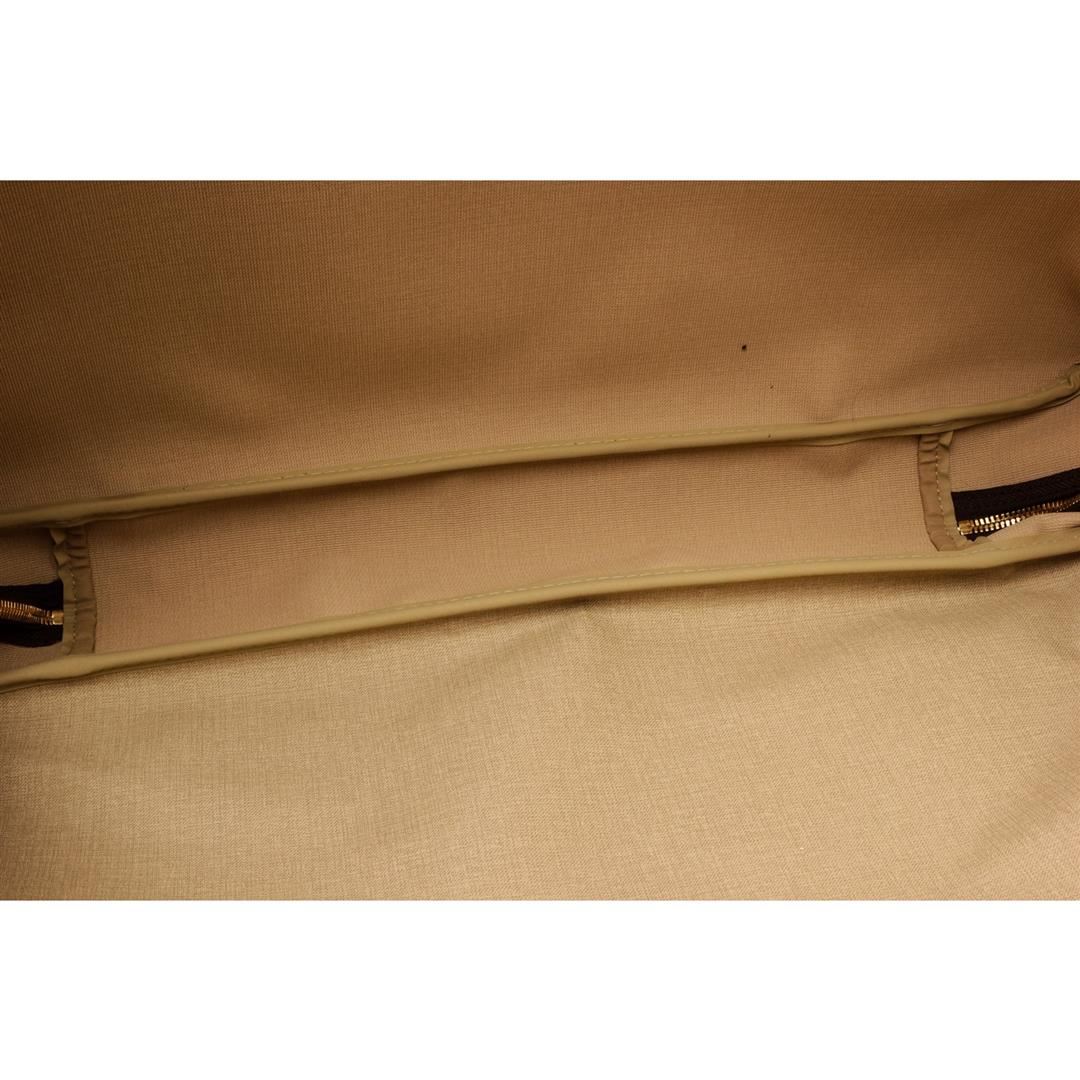 Brown and tan monogram coated canvas Louis Vuitton Alize luggage with brass hardware, tan vachetta leather trim, luggage tag, detachable woven shoulder strap, dual rolled top handles, beige canvas lining, dual interior compartments, single open pocket at interior wall and dual zip closures at top.