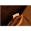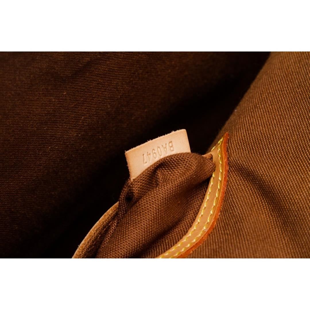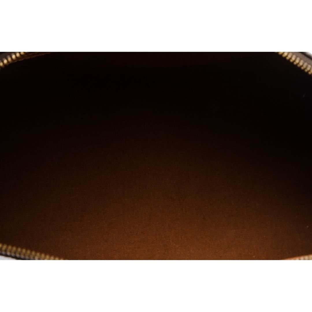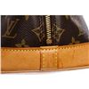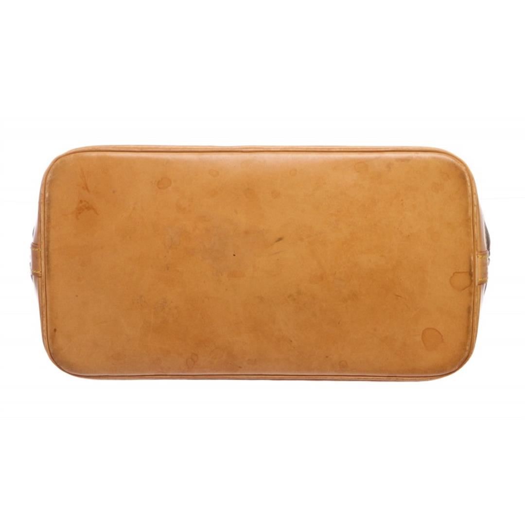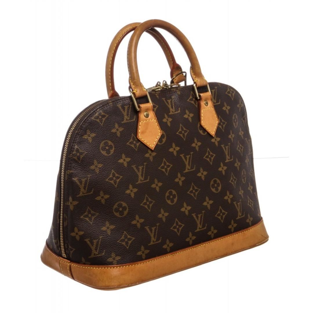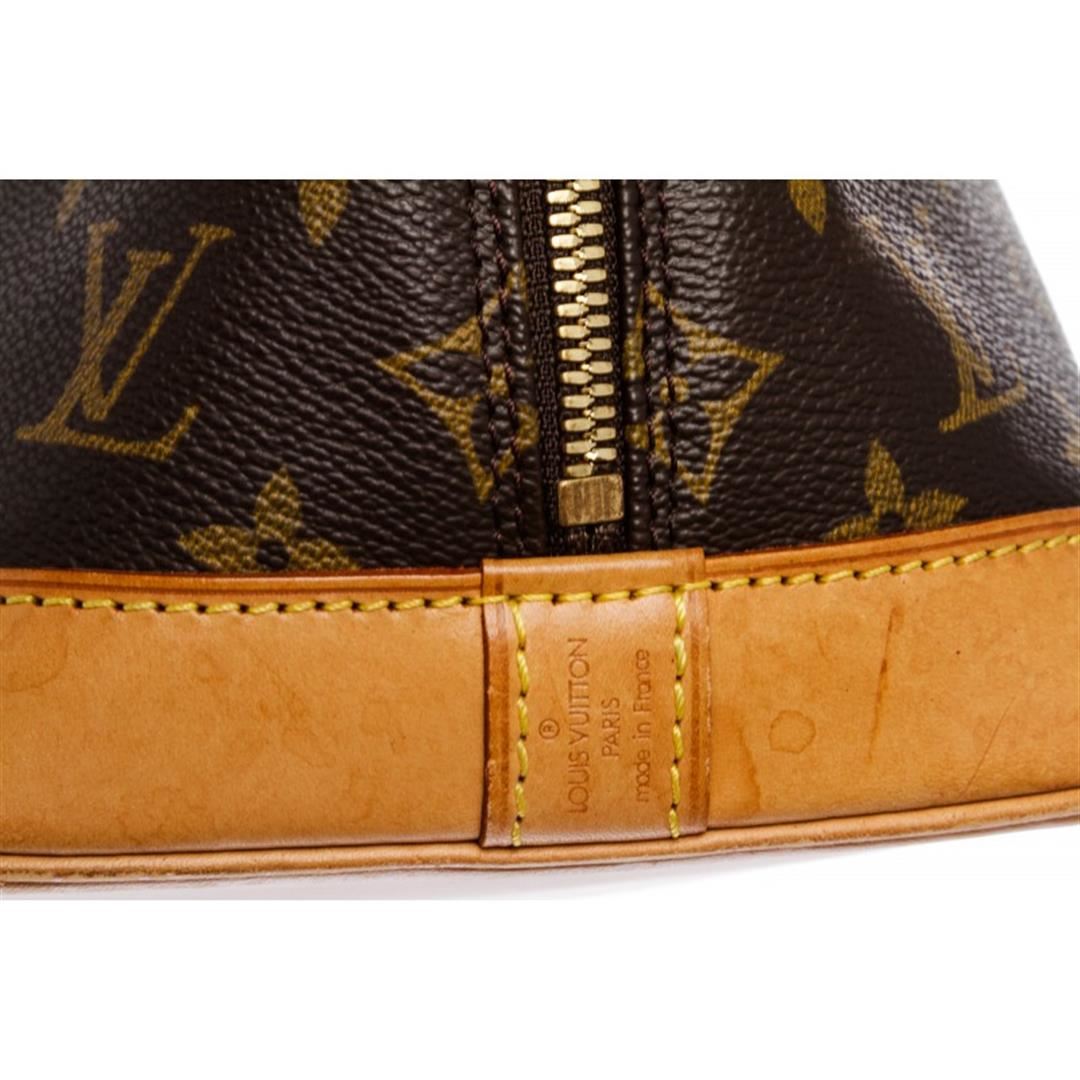 Brown and tan monogram coated canvas Louis Vuitton Alma MM with brass hardware, tan vachetta leather trim, dual rolled top handles, brown canvas lining, singleit pocket at interior wall and two-way zip closures at top.