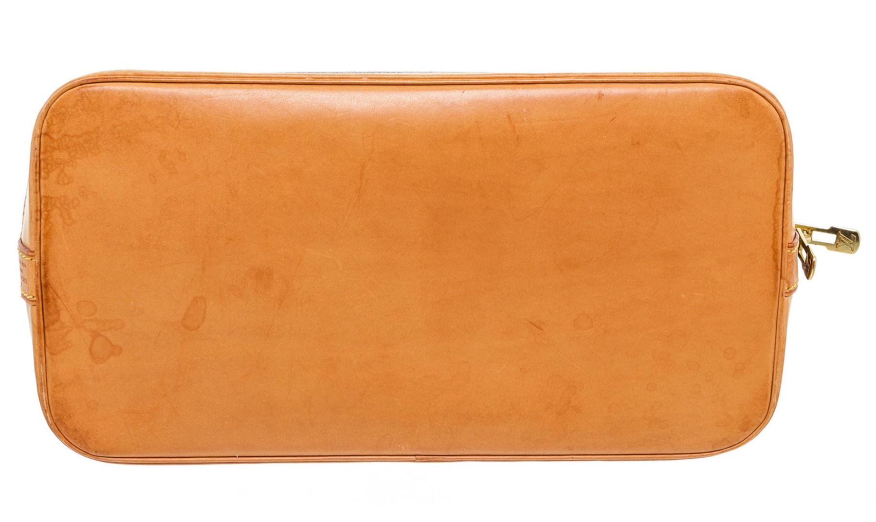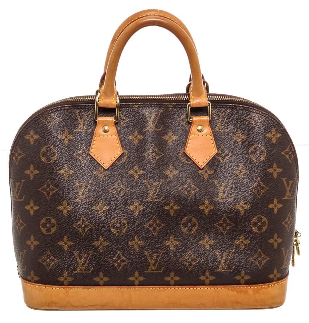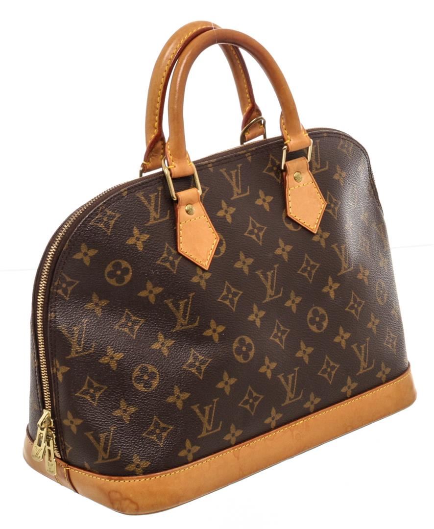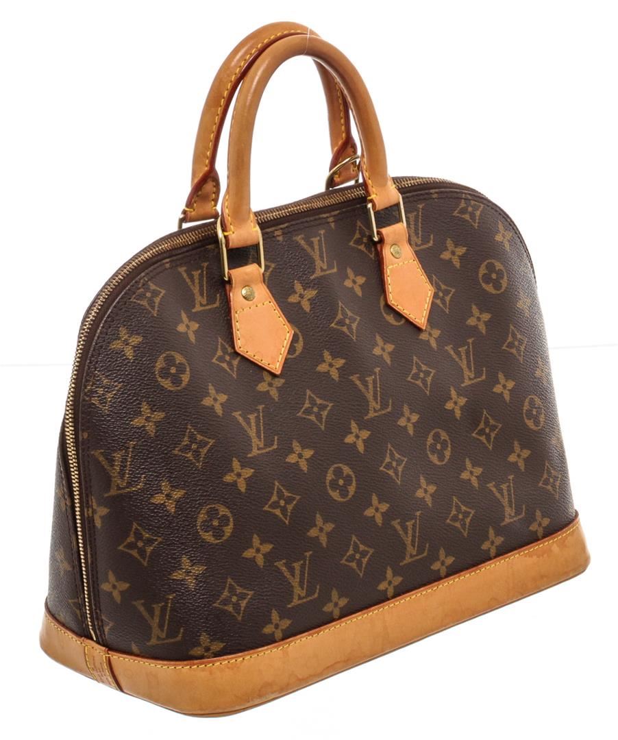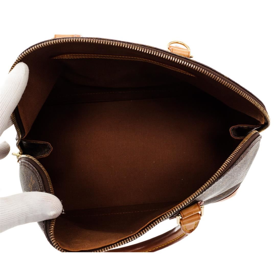 Brown and tan monogram coated canvas Louis Vuitton Alma MM with brass hardware, tan vachetta leather trim, dual rolled top handles, brown canvas lining, single slit pocket at interior wall and two-way zip closures at top.