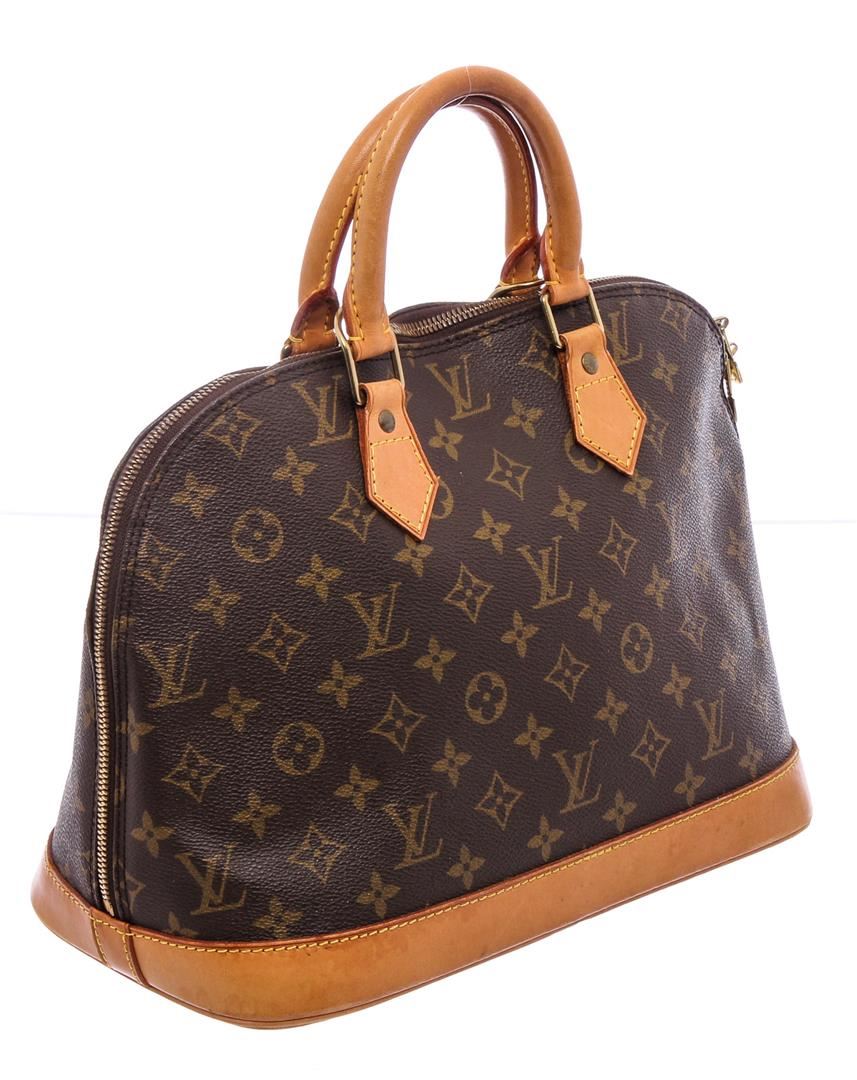 One Louis Vuitton Monogram Canvas Leather Alma MM Handbag. Brown and tan monogram coated canvas Louis Vuitton Alma MM with brass hardware, tan vachetta leather trim, dual rolled top handles, brown canvas lining, single slit pocket at interior wall and two-way zip closures at top.