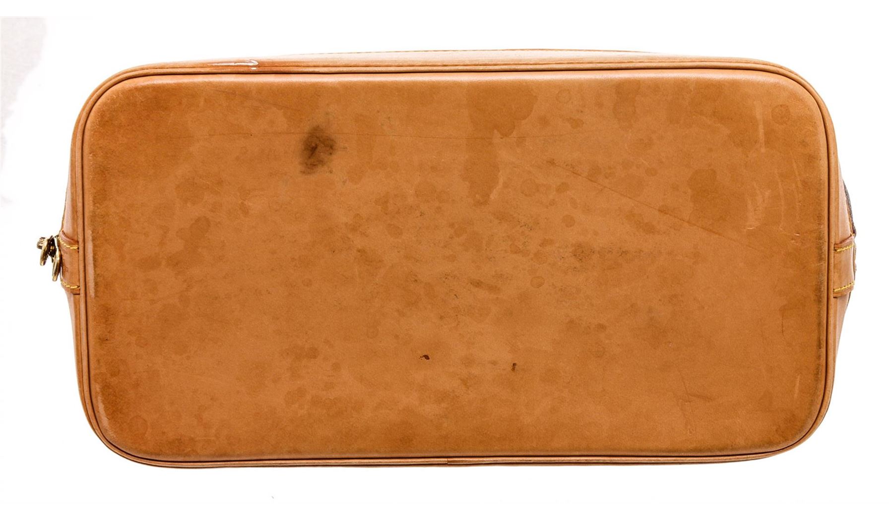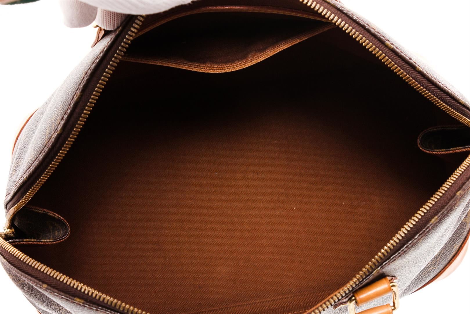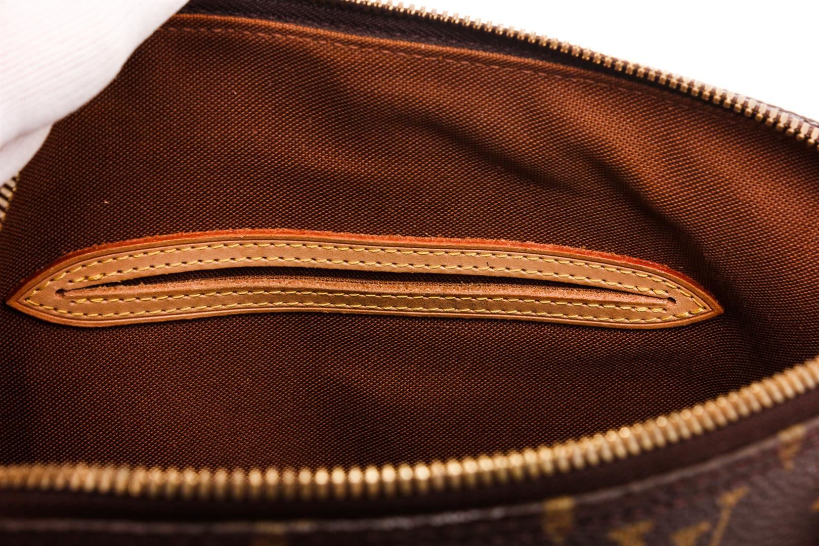 One Louis Vuitton Monogram Canvas Leather Alma MM Handbag. Brown and tan monogram coated canvas Louis Vuitton Alma MM with brass hardware, tan vachetta leather trim, dual rolled top handles, brown canvas lining, single slit pocket at interior wall and two-way zip closures at top.