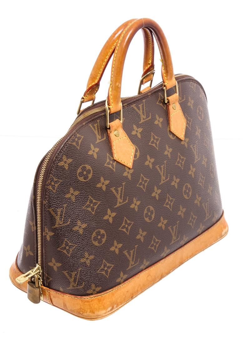 Brown and tan monogram coated canvas Louis Vuitton Alma MM with brass hardware, tan vachetta leather trim, dual rolled top handles, brown canvas lining, single slit pocket at interior wall and two-way zip closures at top.