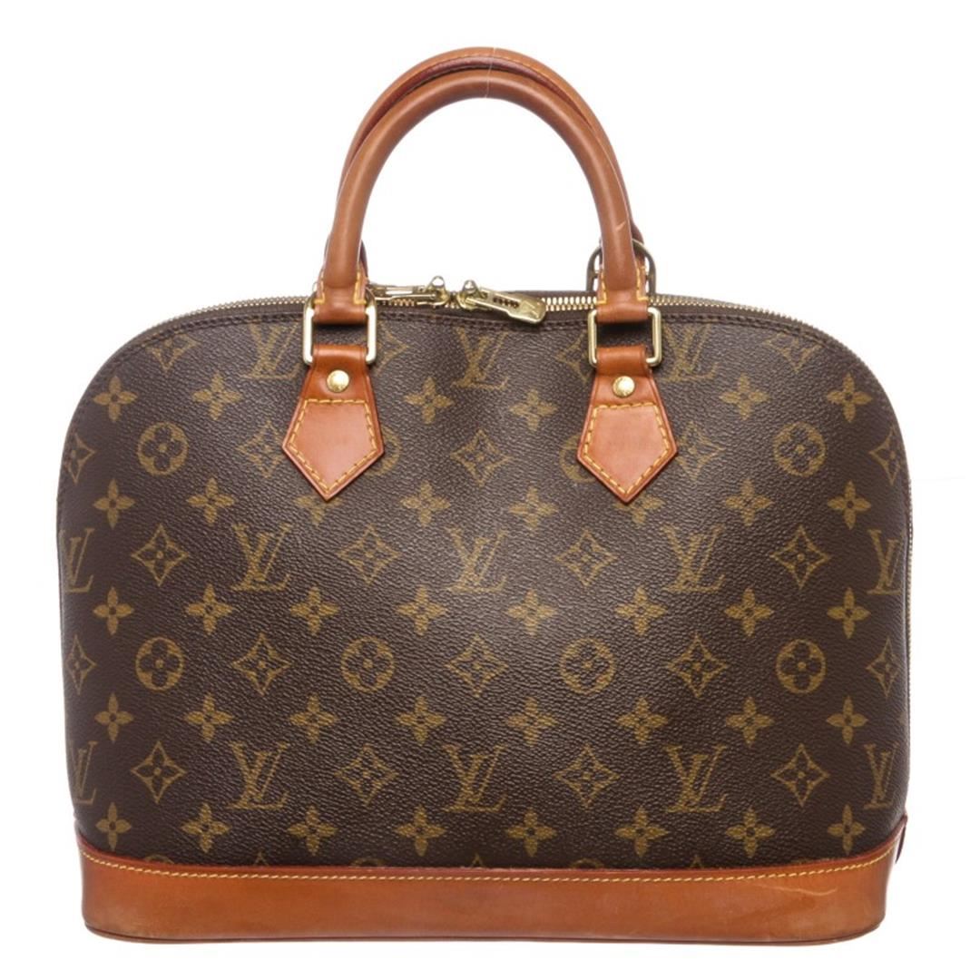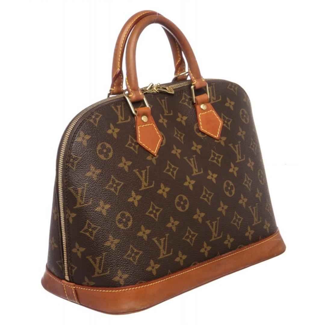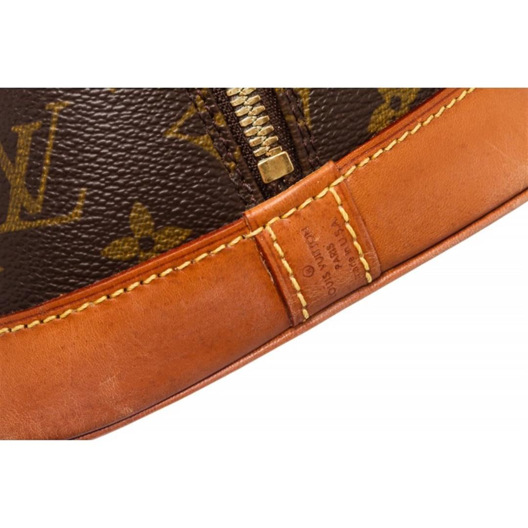Brown and tan monogram coated canvas Louis Vuitton Alma PM with brass hardware, tan vachetta leather trim, dual rolled top handles, brown canvas lining, singleit pocket at interior wall and two-way zip closures at top.