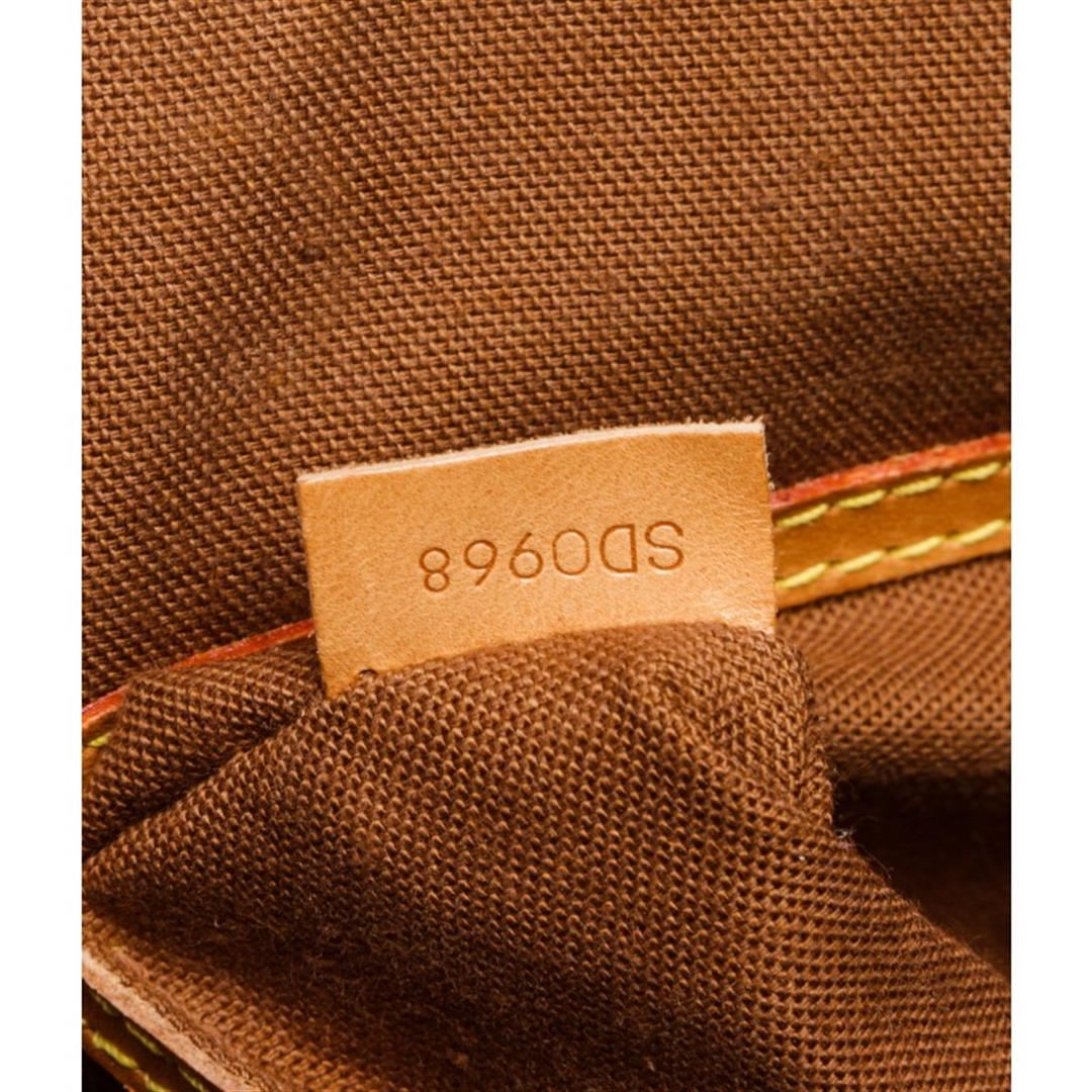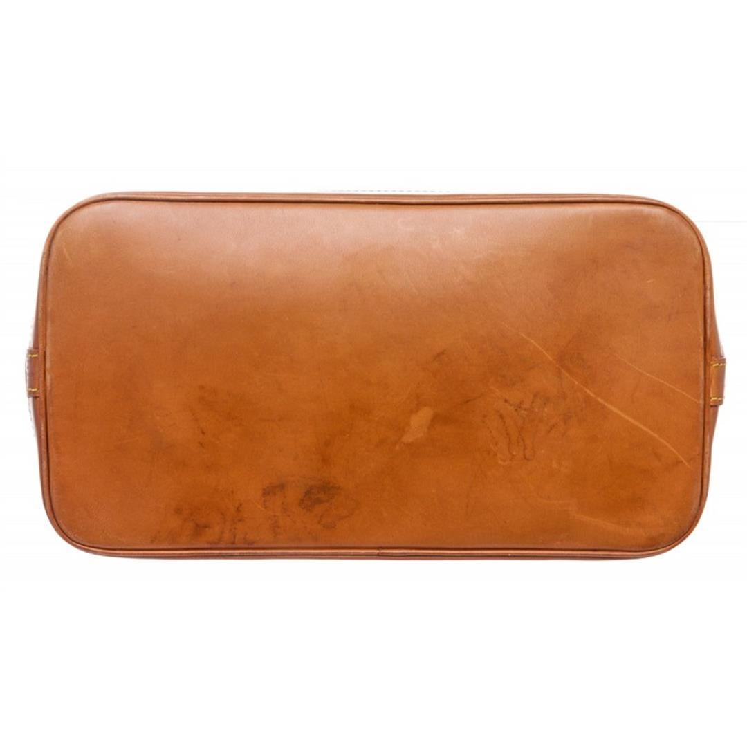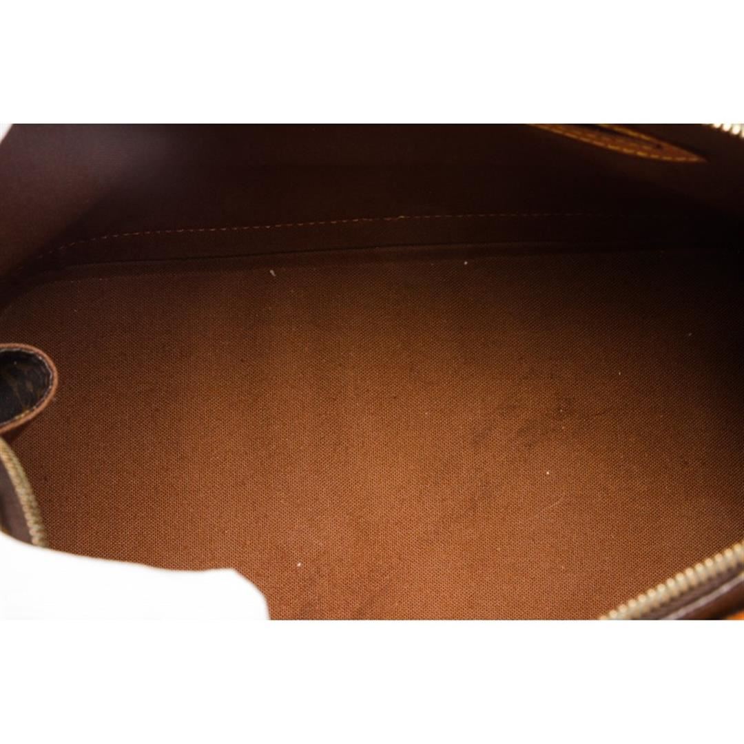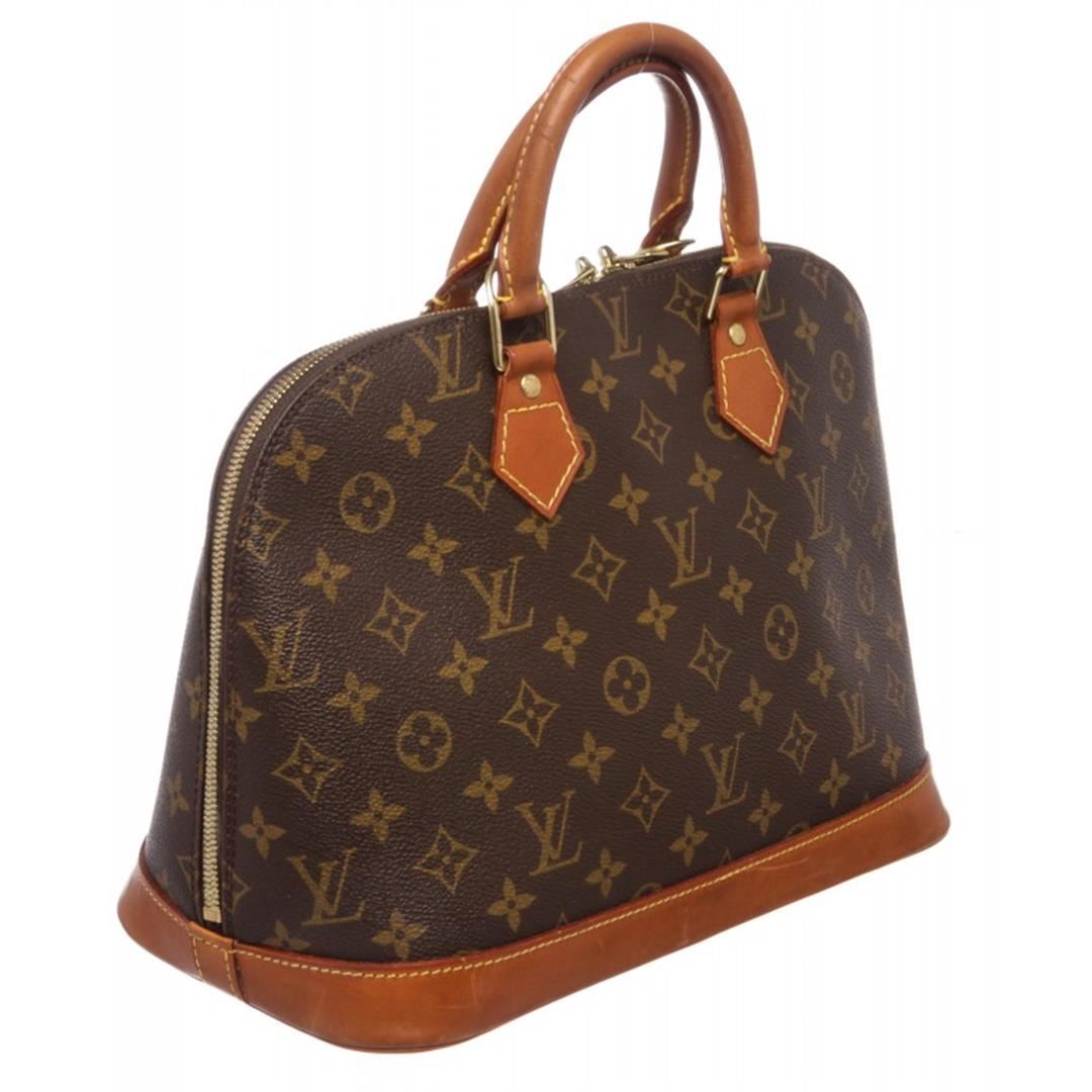 Brown and tan monogram coated canvas Louis Vuitton Alma PM with brass hardware, tan vachetta leather trim, dual rolled top handles, brown canvas lining, singleit pocket at interior wall and two-way zip closures at top. Item is pre-owned.