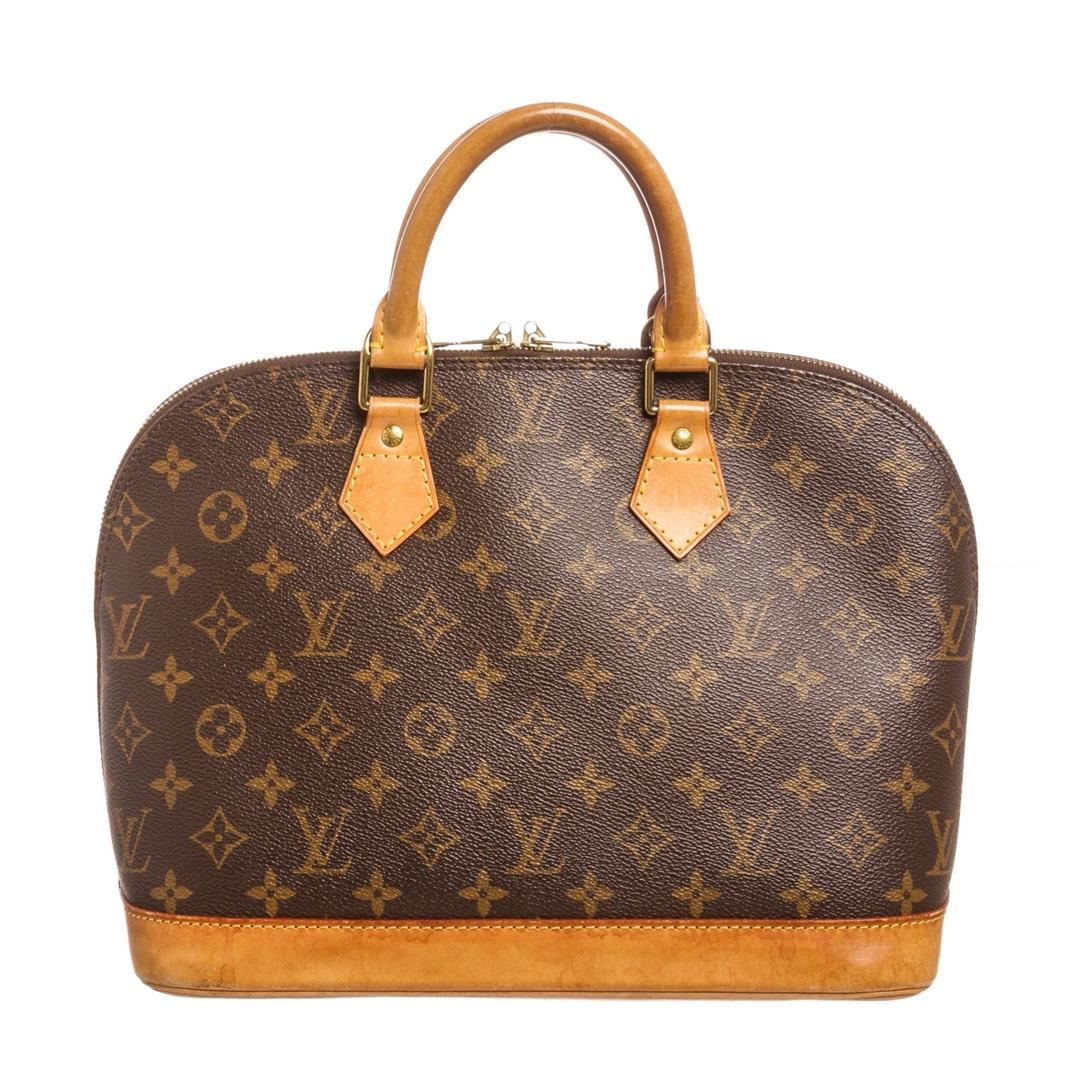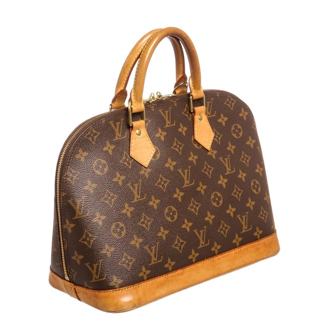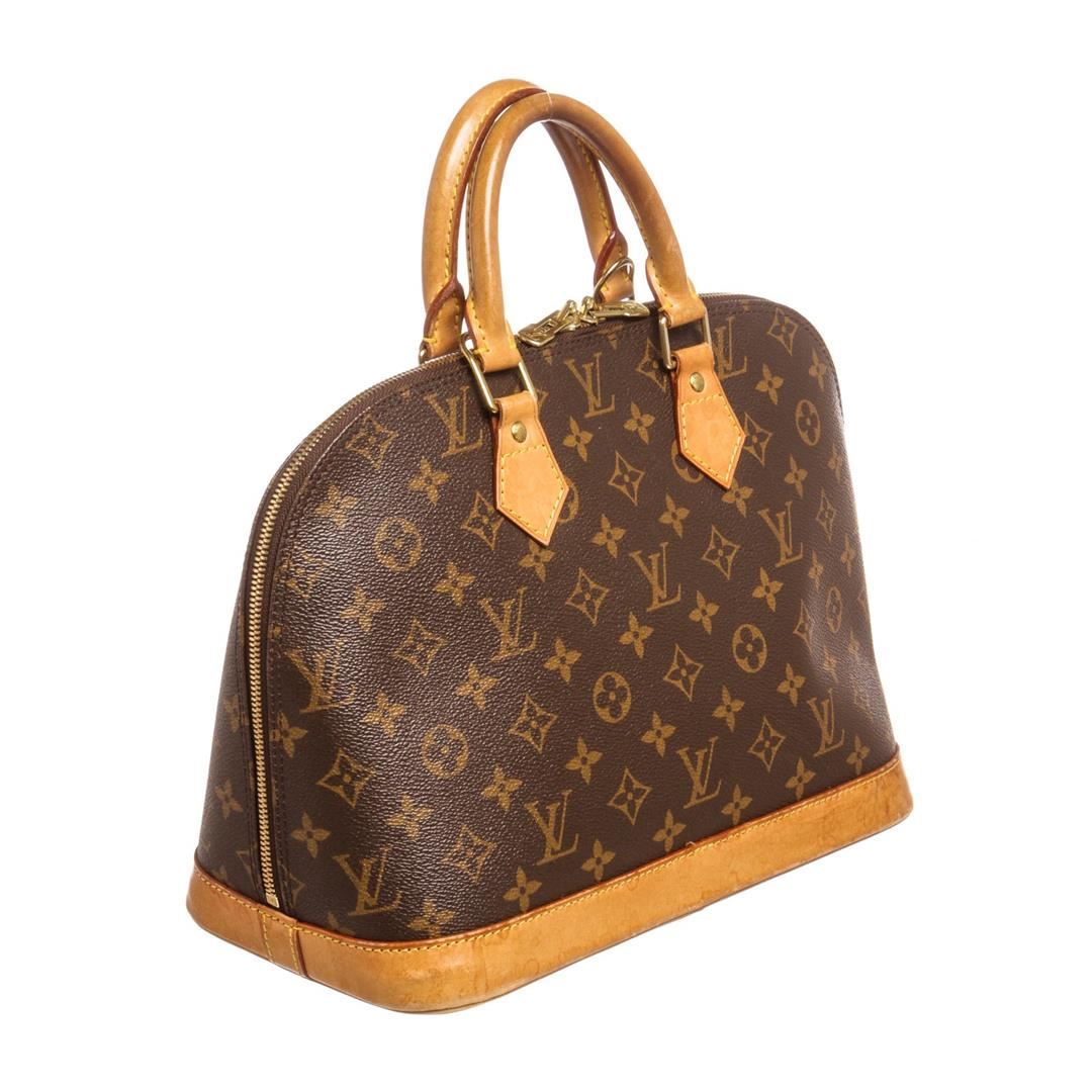 Brown and tan monogram coated canvas Louis Vuitton Alma PM with brass hardware, tan vachetta leather trim, dual rolled top handles, brown canvas lining, single pocket at interior wall and zip closure at top. Item is pre-owned.