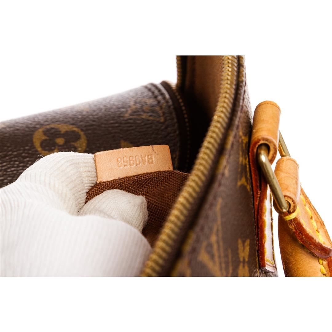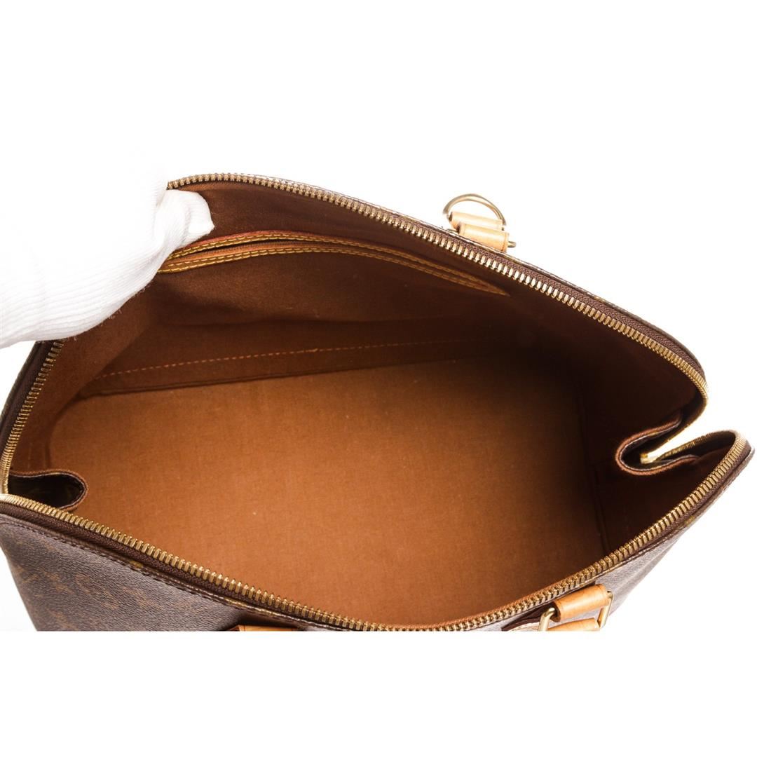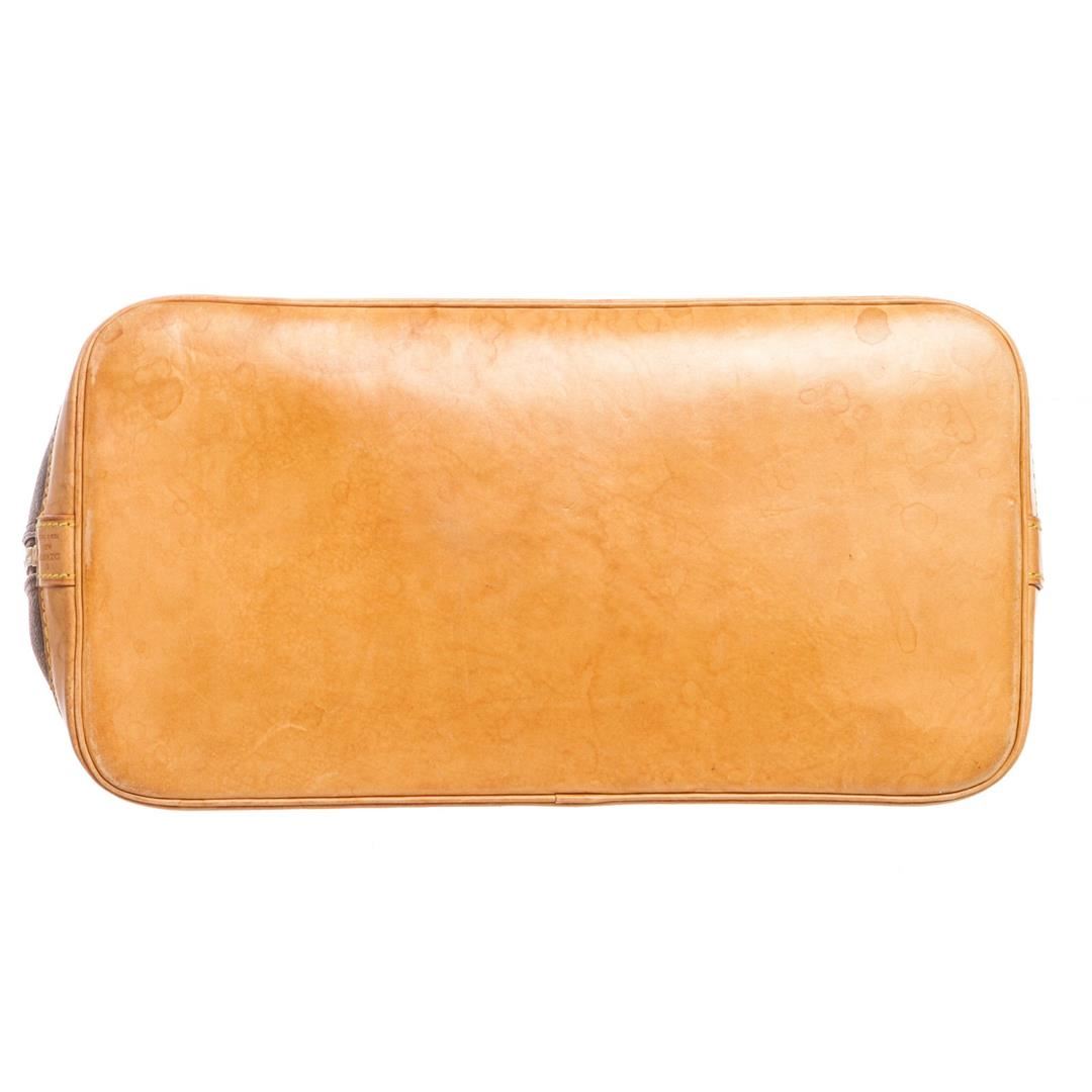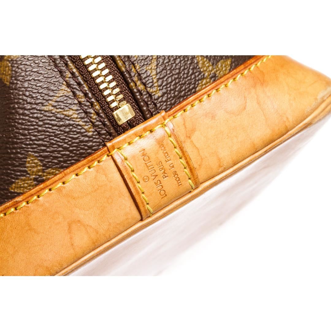 Brown and tan monogram coated canvas Louis Vuitton Alma PM with brass hardware, tan vachetta leather trim, dual rolled top handles, brown canvas lining, single pocket at interior wall and zip closure at top. Item is pre-owned.