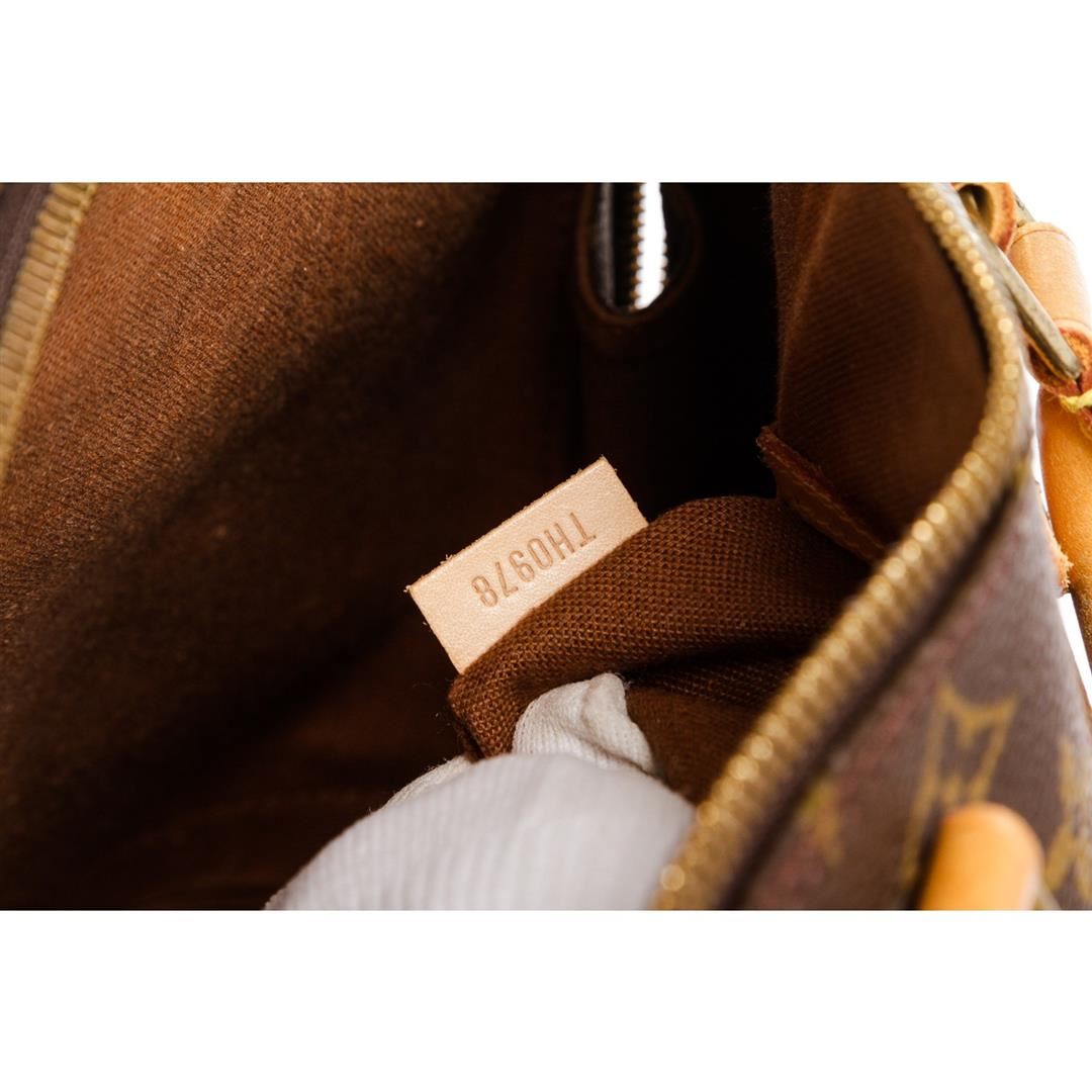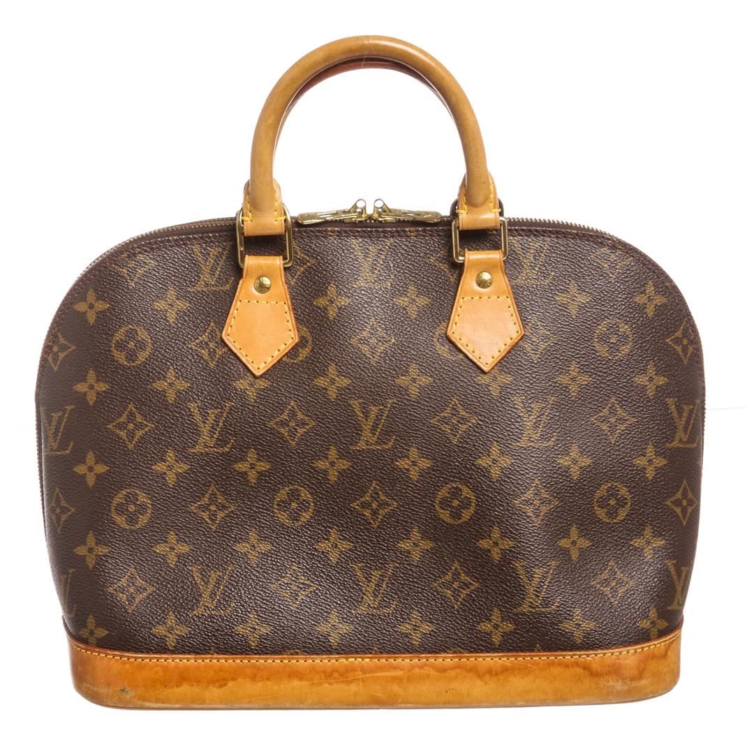Brown and tan monogram coated canvas Louis Vuitton Alma PM with brass hardware, tan vachetta leather trim, dual rolled top handles, brown canvas lining, single pocket at interior wall and zip closure at top. Item is pre-owned.