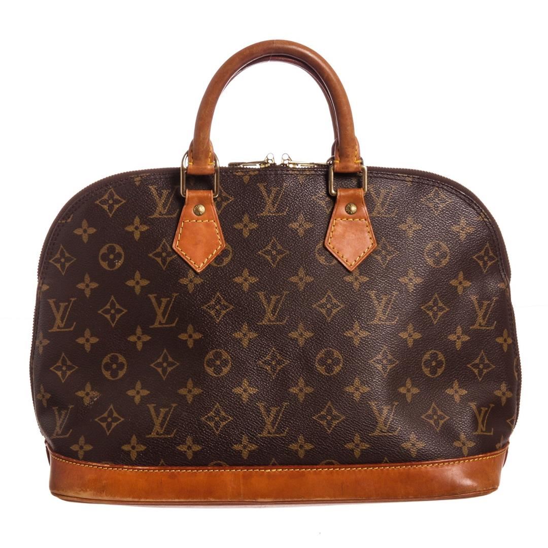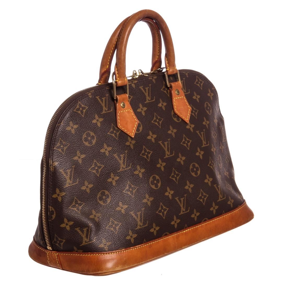 Brown and tan monogram coated canvas Louis Vuitton Alma PM with brass hardware, tan vachetta leather trim, dual rolled top handles, brown canvas lining, single pocket at interior wall and zip closure at top. Dimensions = 12.5"x5.5"x9"xBag Drop:3"/31.75cmx13.97cmx22.86cm Bag Drop:7.62cm. Item is pre-owned.
